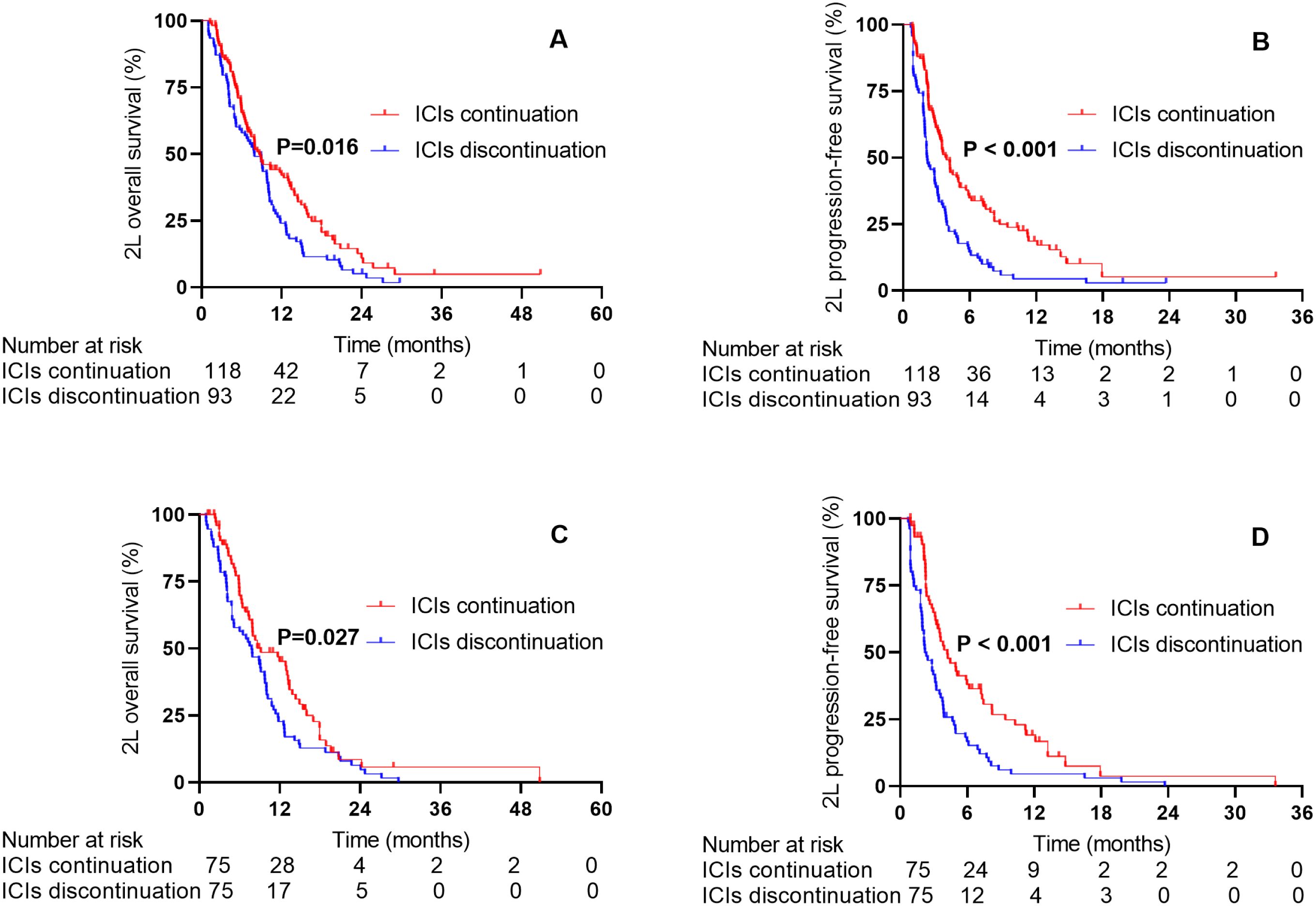 Figure 1. The 2L-OS and 2L-PFS between the ICIs continuation group and the ICIs discontinuation group before and after PSM. (A) 2L-OS before PSM. (B) 2L-PFS before PSM. (C) 2L-OS after PSM. (D) 2L-PFS after PSM.