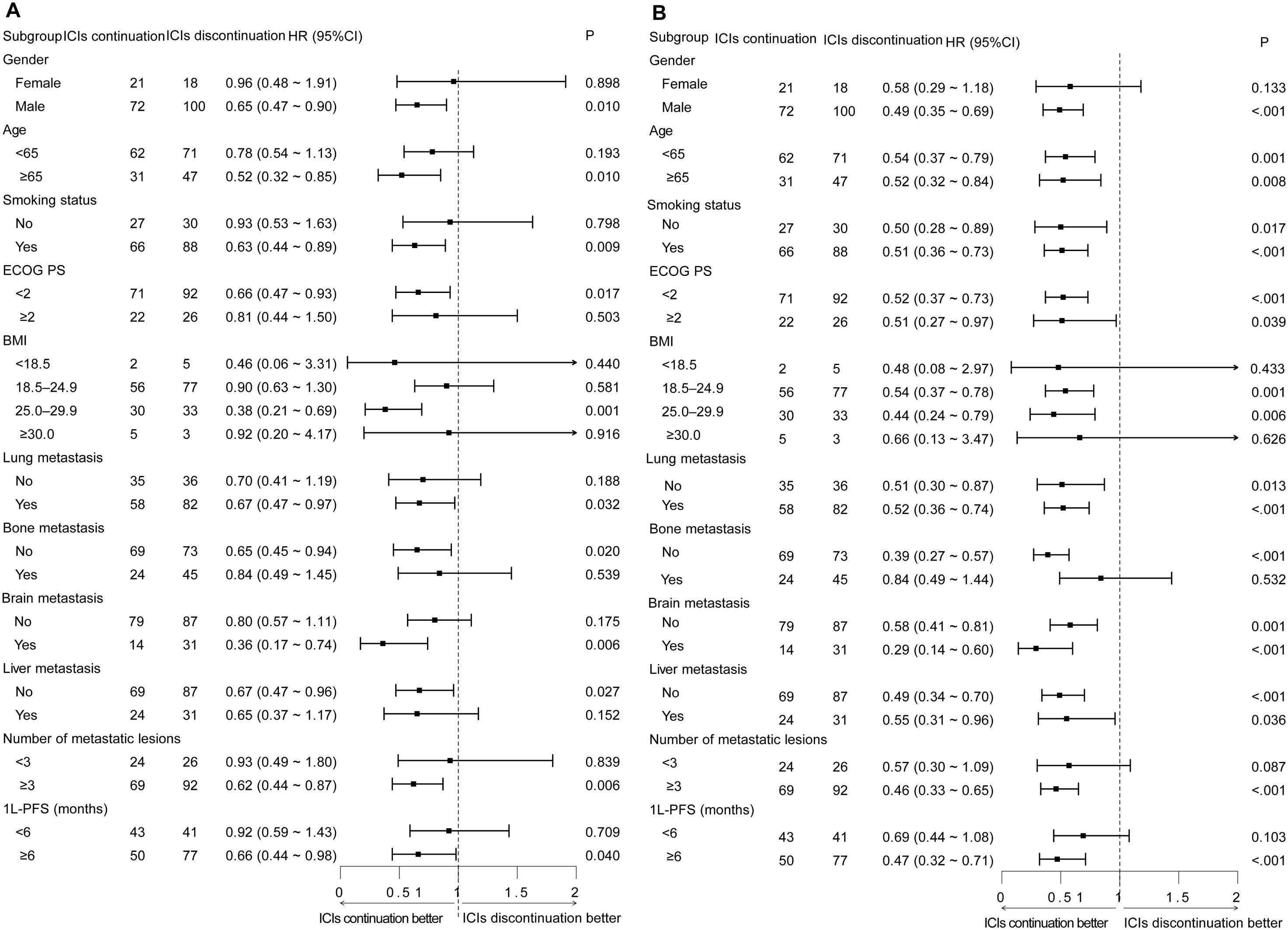 Prespecified subgroup analyses stratified by baseline characteristics were performed. It was revealed that in most subgroups, ICIs continuation was beneficial in terms of 2L-OS and 2L-PFS (Figures 2A, B).