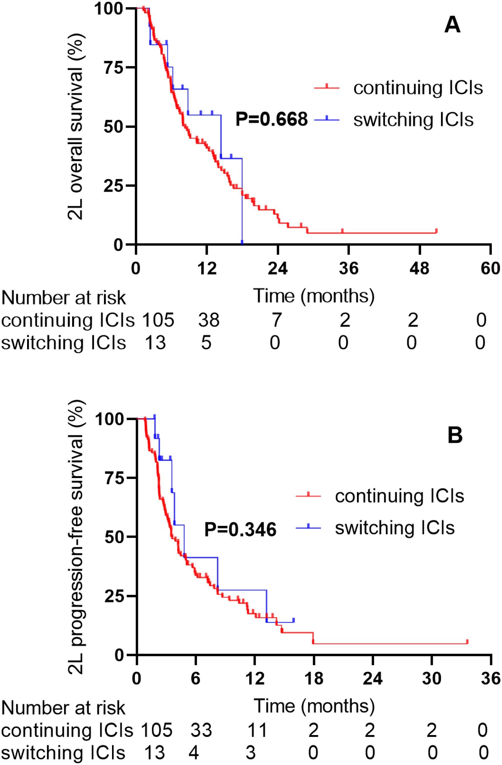 Figure 3. The 2L-OS and 2L-PFS between the continuing ICIs group and the switching ICIs group. (A) 2L-OS for the continuing ICIs group and the switching ICIs group. (B) 2L-PFS for the continuing ICIs group and the switching ICIs group.