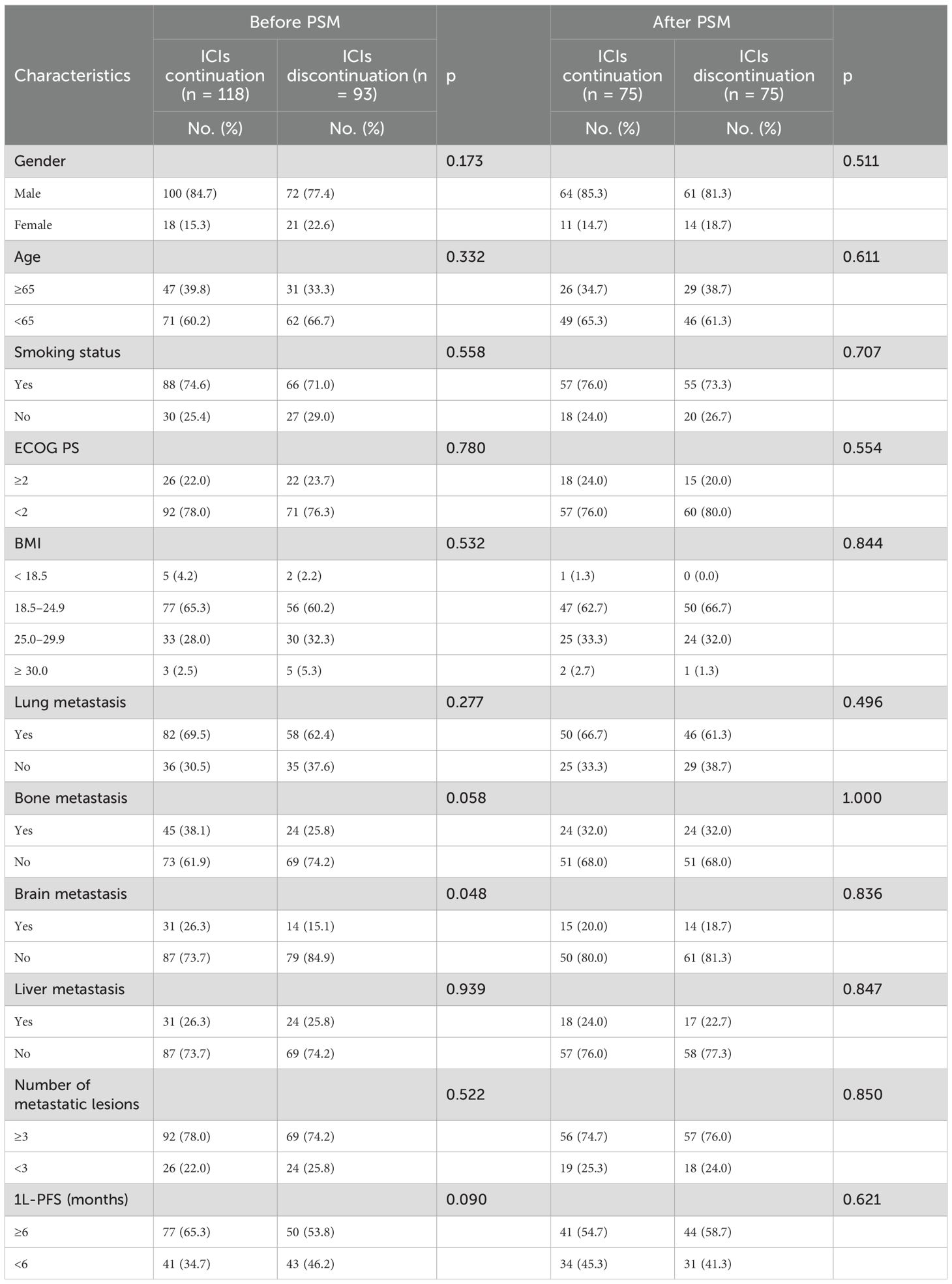 Eligibility for the study required the availability of a complete medical record. Consequently, of the initially screened 216 patients, 5 were excluded due to incomplete data (3 lacking definitive 1L-PFS duration and 2 lacking clear documentation of the number of metastatic lesions.). A total of 211 patients were included in this study, among whom 118 formed the ICIs continuation group and 93 formed the ICIs discontinuation group. The median age of the included patients was 62 years (range: 19–87 years), and 81.5% of all patients were male, while 73% had a history of smoking. An ECOG PS ≥2 was present in 22.7% of patients. The majority of patients (63.0%) had normal weight (BMI 18.5-24.9); 29.9% were overweight (BMI 25.0-29.9). Metastatic involvement included lung (66.4% of the included cases), bone (32.7%), brain (21.3%), and liver (26.1%) involvement. Moreover, 76.3% of the patients presented with ≥3 metastatic lesions, whereas 60.2% of the patients achieved 1L-PFS ≥ 6 months. After PSM, the baseline characteristics were well balanced between the groups (Table 1).