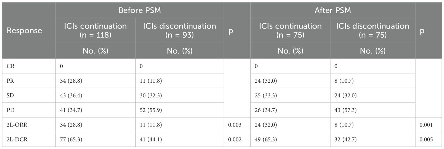 The 2L-ORR was 28.8% in the ICIs continuation group and 11.8% in the ICIs discontinuation group (p = 0.003), while the 2L-DCRs for the two groups were 65.3% and 44.1% (P = 0.002), respectively. After 1:1 PSM, the 2L-ORR was 32.0% in the ICIs continuation group and 10.7% in the ICIs discontinuation group (P = 0.001), while the 2L-DCRs for the two groups were 65.3% and 42.7% (P = 0.005), respectively (Table 2).