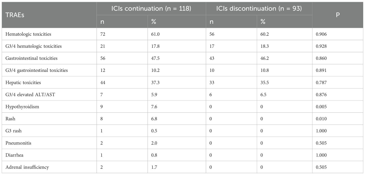 As shown in Table 3, except for the incidence of immune-related adverse events (irAEs), the incidence of treatment-related adverse events (TRAEs) was similar between the two groups, and no grade 4 or 5 AEs were noted. The observed irAEs included hypothyroidism, rash, pneumonitis, diarrhea, and adrenal insufficiency. Only one patient (0.5%) developed a grade 3 immune-mediated rash, while no grade 4 or 5 irAEs were recorded.