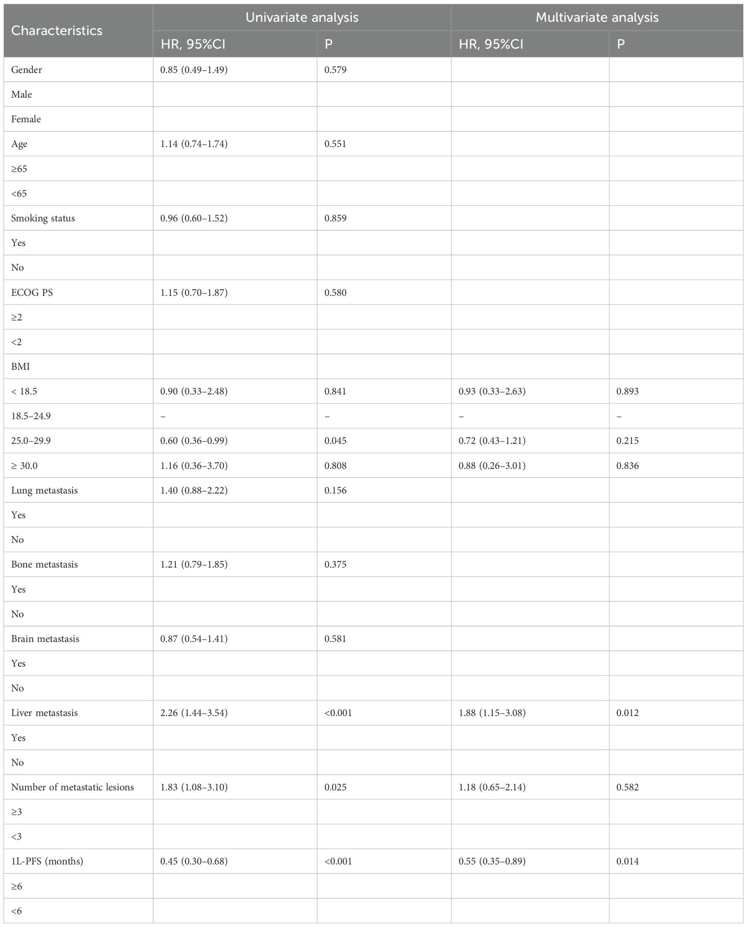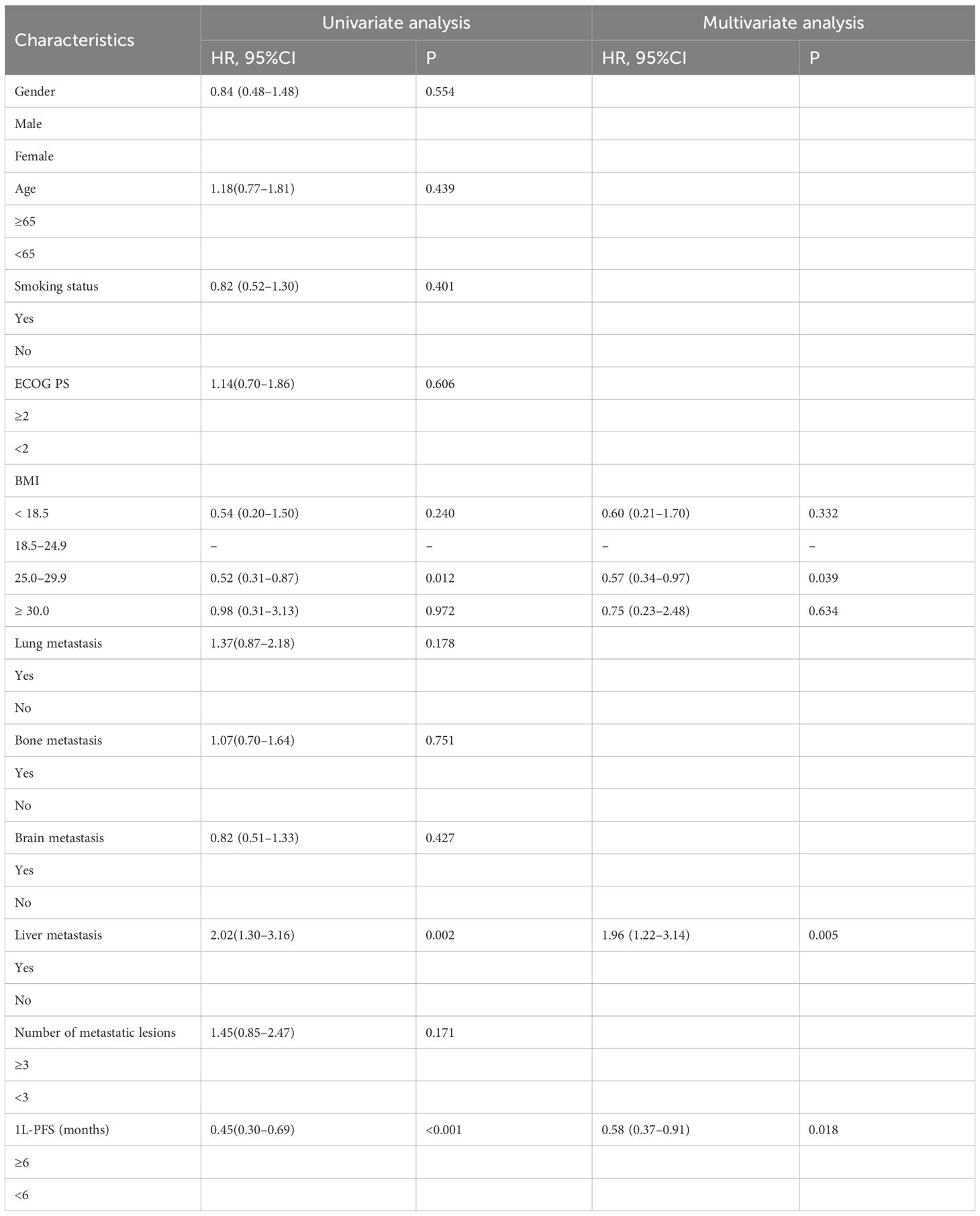 In the ICIs continuation group, the risk factors affecting 2L-OS and 2L-PFS were explored next in this study. Multivariate Cox regression analyses revealed baseline liver metastasis as an independent factor associated with worse 2L-OS and 2L-PFS and 1L-PFS as an independent factor associated with favorable 2L-OS and 2L-PFS. Additionally, overweight (BMI 25.0-29.9) was identified as an independent prognostic factor for favorable 2L-OS (Tables 4, 5).
