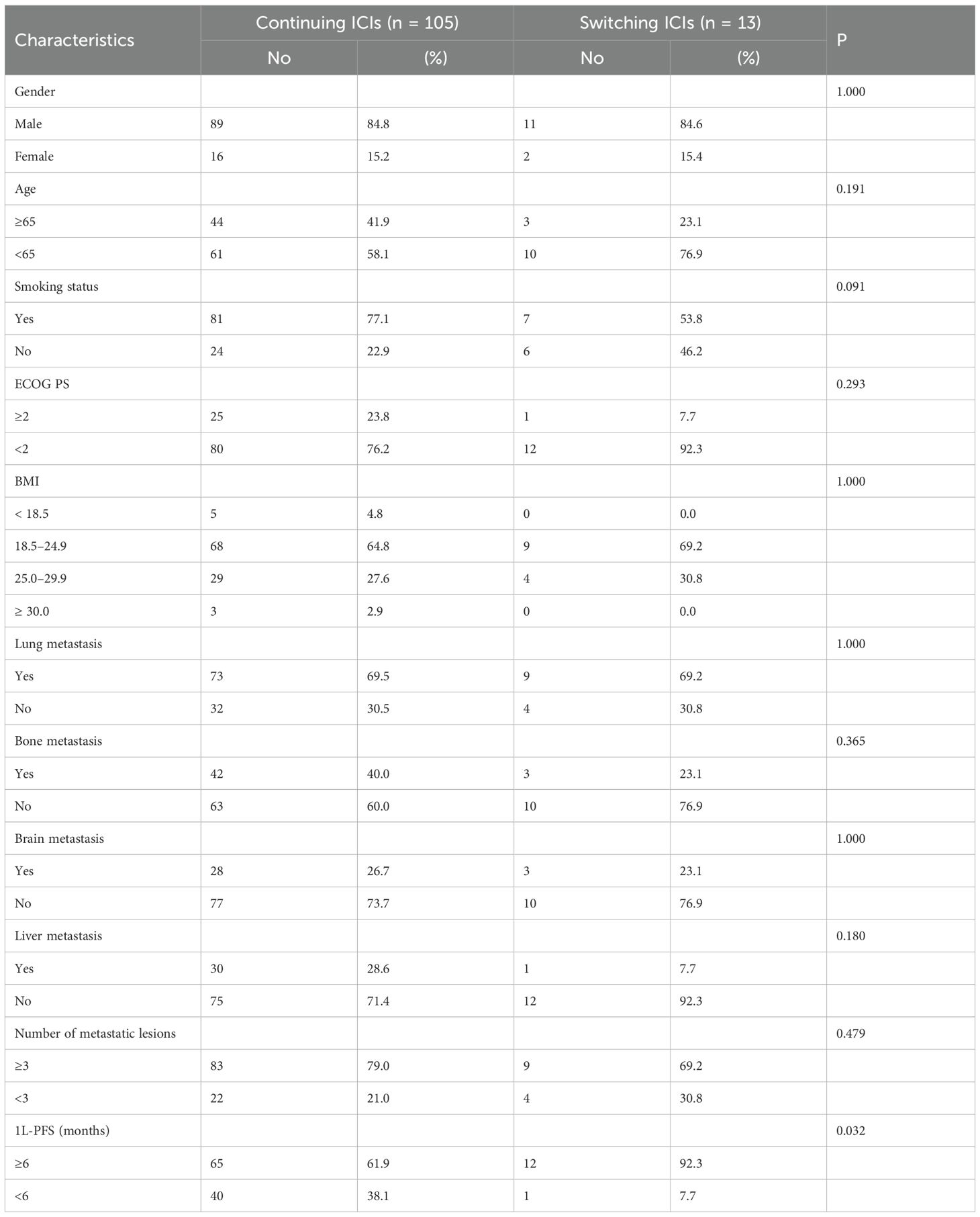 In the ICIs continuation cohort, 105 patients received the same ICIs throughout the 2L therapy, and this group was defined as the continuing ICIs group. The remaining 13 patients who received 2L ICIs therapy with treatment switched between anti-PD-1 and anti-PD-L1 antibodies were designated as the switching ICIs group. The baseline characteristics of the two groups were essentially the same (Table 6).