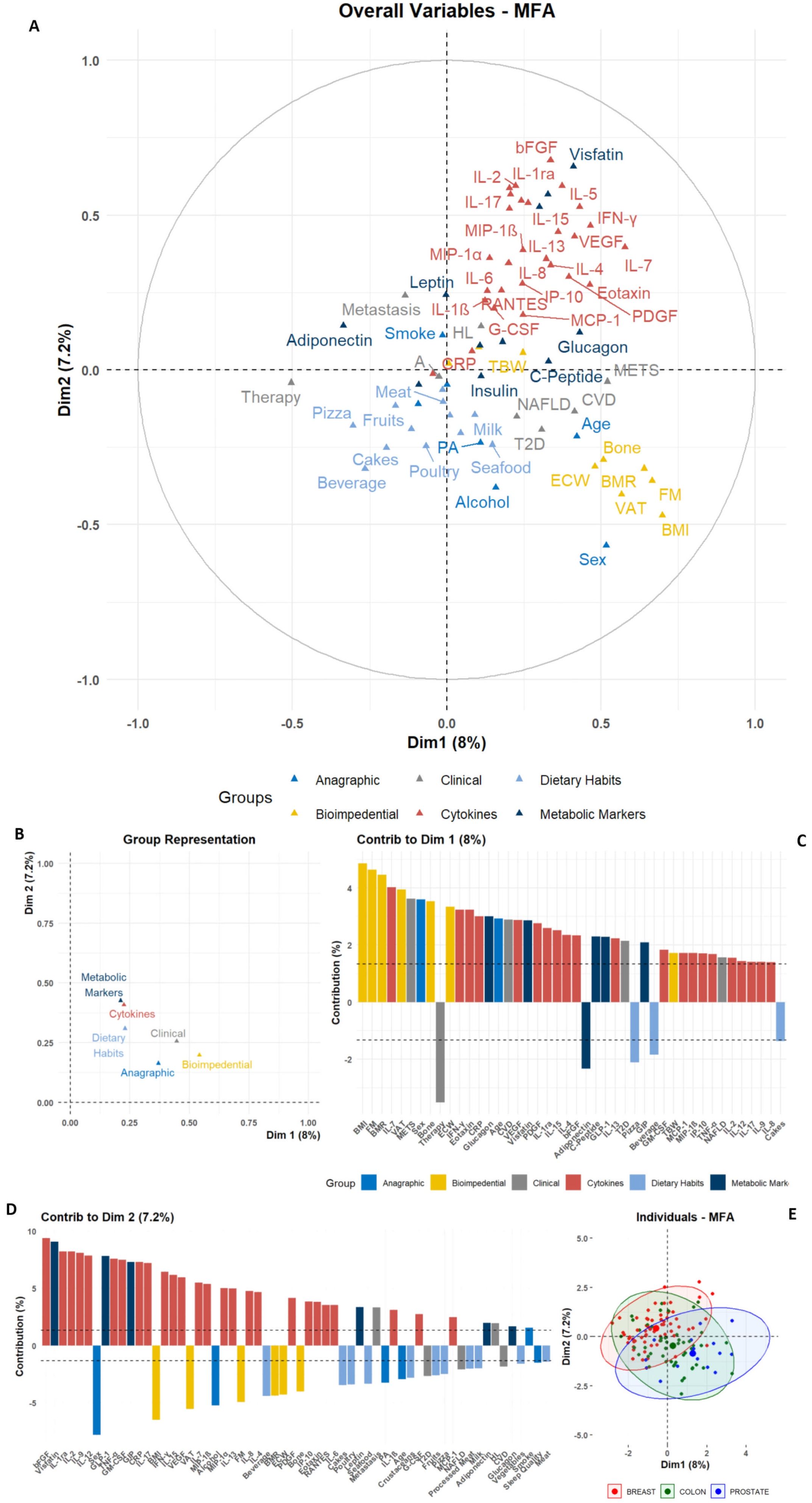 Figure 1. Graphic representation of Multiple Factor Analysis (MFA). The MFA output for anagraphic, biometrical, clinical, dietary, and molecular parameters is reported; (A) Biplot depicting the color-coded group variables projections on the two main dimensions (Dim1 and Dim2), allowing the identification of intra- and inter-group clustering. (B) Dot plot for groups distributions among Dim1 and Dim2. (C, D) Bar plots depicting the single-variable relative contribution to Dim1 and Dim2 variance; the plots only depict variables with an absolute value higher than the mean (dashed line). (E) Scatter plot depicting the individual distribution on Dim1 and Dim2, color-coded according to the tumor groups, as shown in the legend.