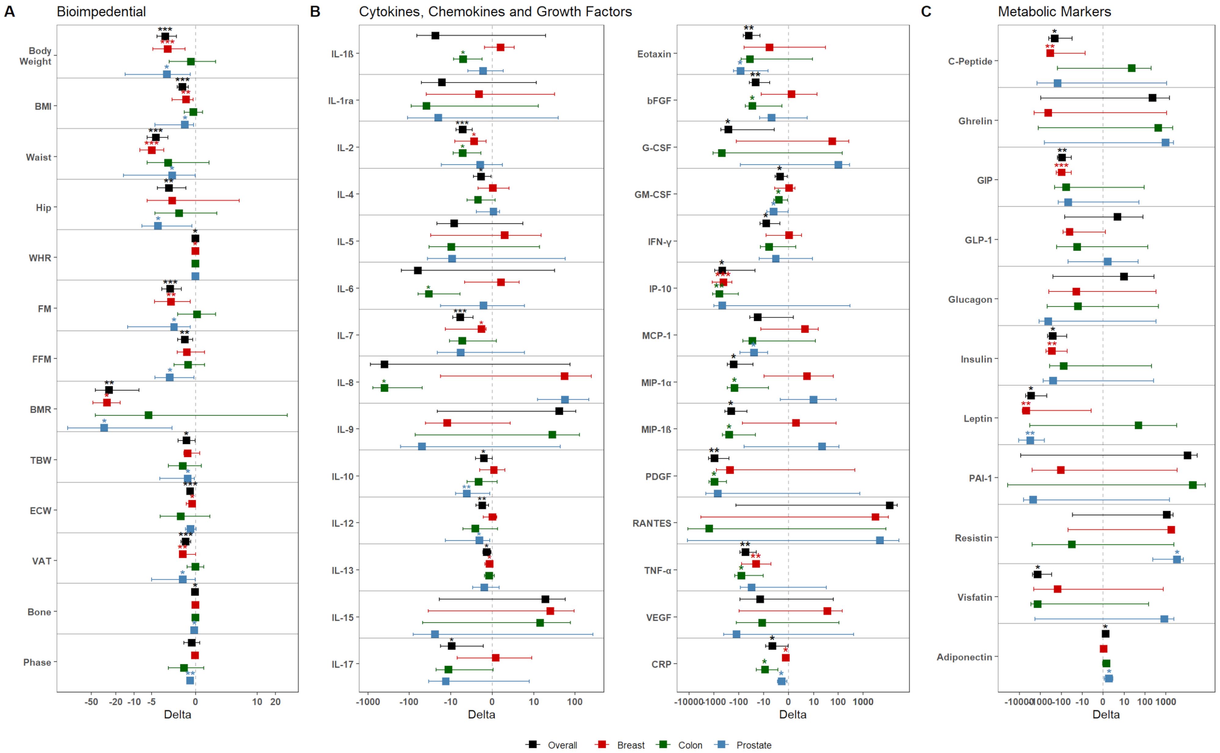 Figure 2. Dietary intervention’s impact on the population. Graphs show the variation of (A) bioimpedential, (B) cytokines, chemokines, and growth factors, and (C) metabolic markers through the overall population and the three tumor subgroups, color-coded accordingly as shown in the legend (black – Overall; red – BC; green – CC; blue – PC). For each parameter, mean variation (square) and 95% confidence intervals (whiskers) between T0 and T1 are represented. Asterisks denote distributions significantly different from zero (*: p-value <0.05; **: p-value <0.01; ***: p-value <0.001).
