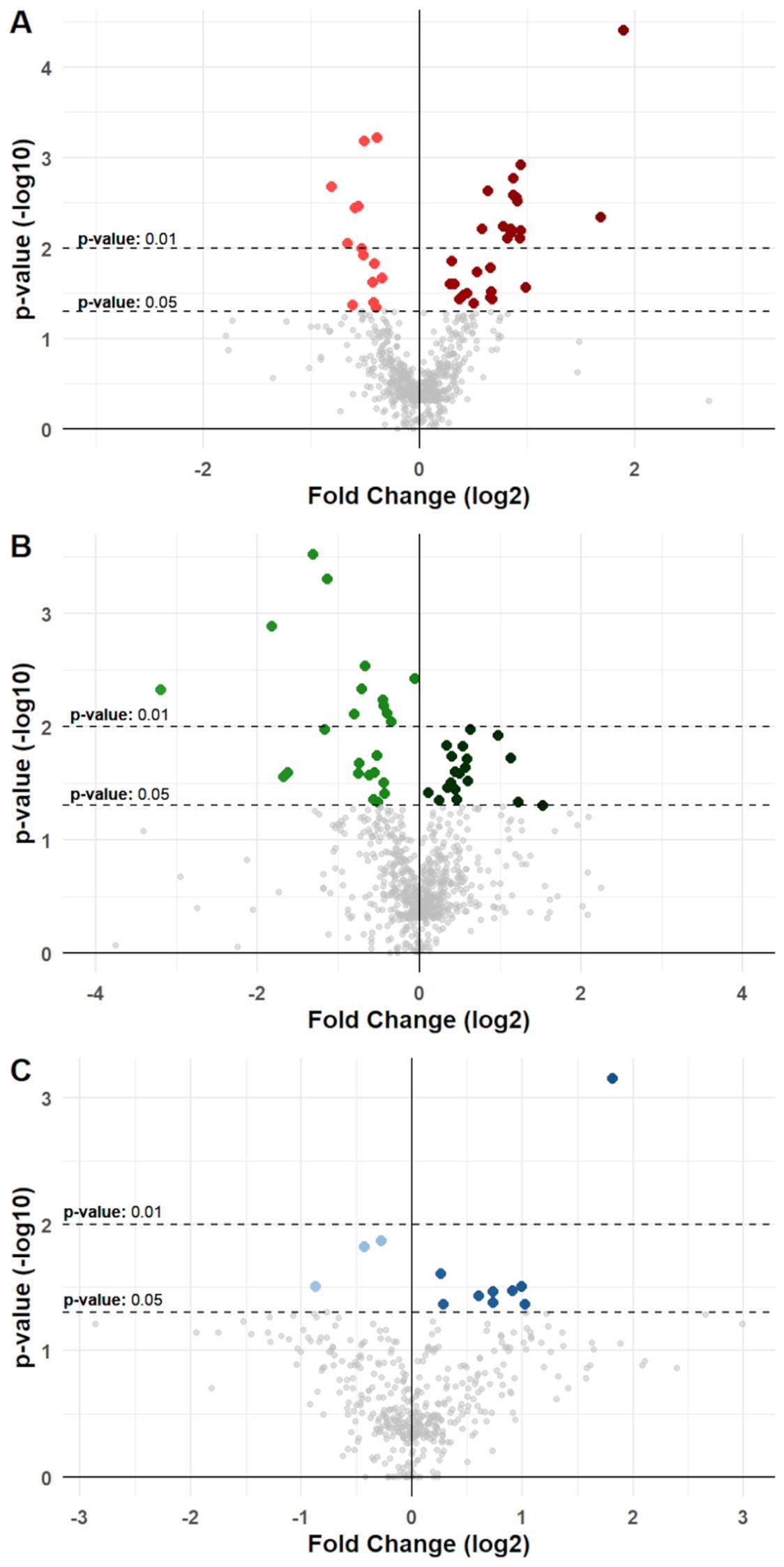 Figure 3. Differential variation for molecules in cancer groups. Volcano plots show differential variations for nutrition-modified cytokines, chemokines, growth factors, and metabolic markers in (A) BC, (B) CC, and (C) PC patients. Each dot represents a protein stratified for a single specific anagraphic, clinical or dietary factor. X-axes represent fold change (log2 transformed) and Y-axes represent p-value (-log10 transformed). Dotted lines denote thresholds of statistical significance (p-values <0.05 or <0.01). Dots with a brighter color represent a significant reduction for a specific molecule when associated with a specific factor, while dots with a darker color represent a significant increase. Significant comparisons are shown in detail in Supplementary Tables S6 to S8 and in Supplementary File S1.