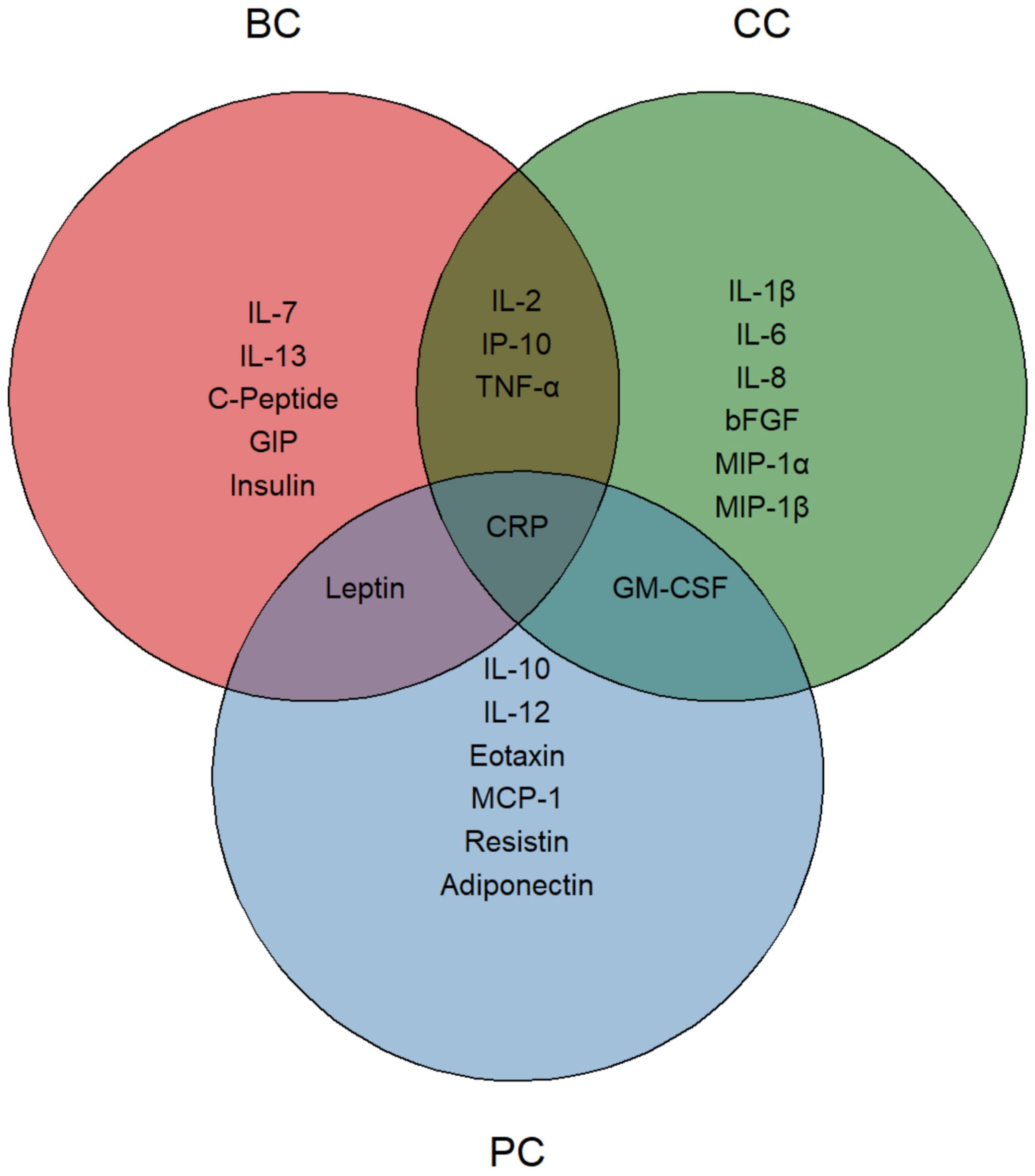 Figure 4. Nutritionally modified cytokines, chemokines, growth factors and metabolic markers. Venn diagram representing the significantly modified circulating molecules. Each circle identifies a specific tumor group, with reduced molecules listed within each area. The intersections highlight significantly modified molecules shared between two or more groups. CRP, positioned at the center, indicates its presence in all three groups.