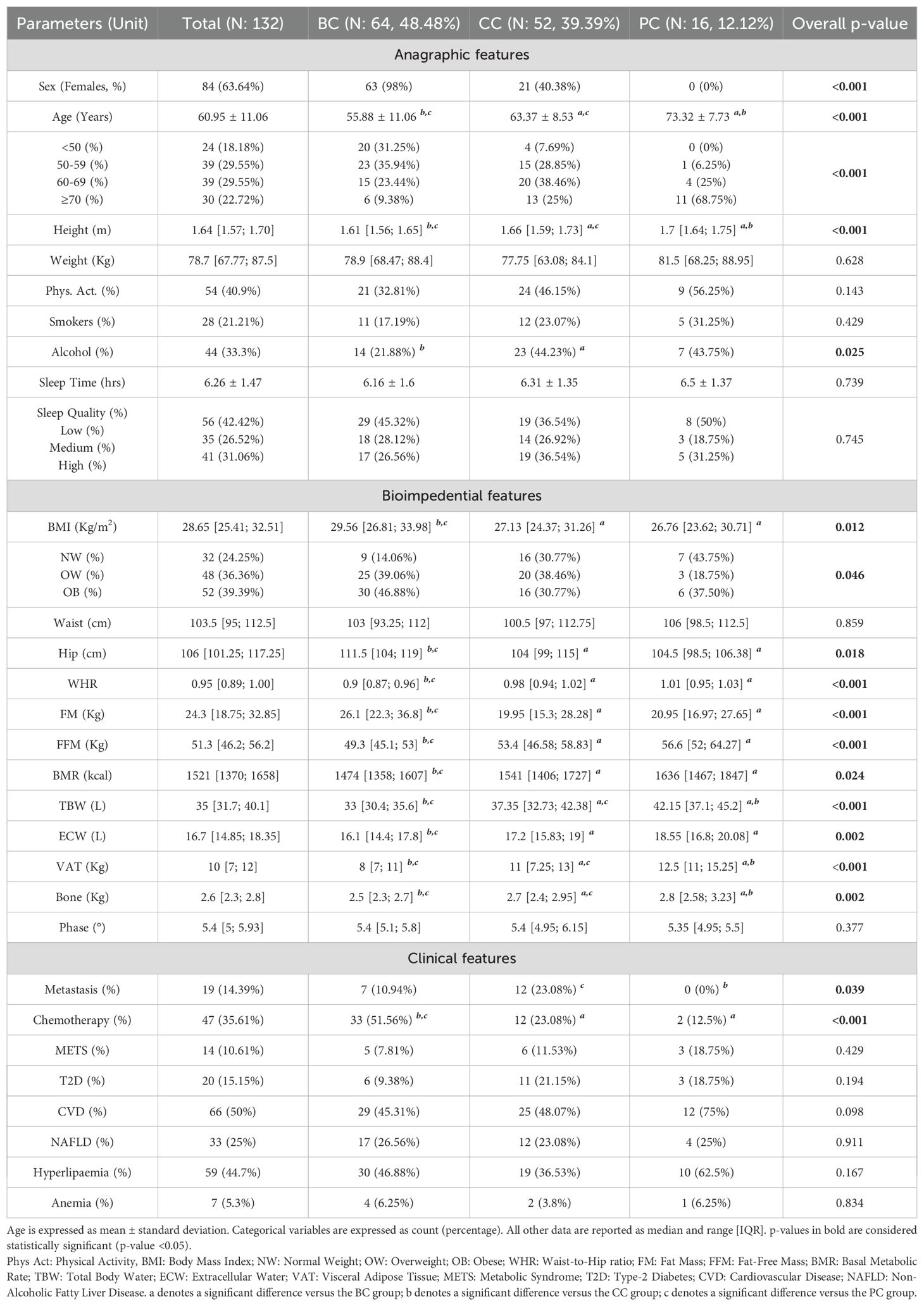Bioimpedance data reflected the marked anagraphical and physical differences among the three groups. Presence of Metastasis was reported mainly for CC patients (23.08%), while chemotherapic treatment for BC patients (51.56%) (Table 1).