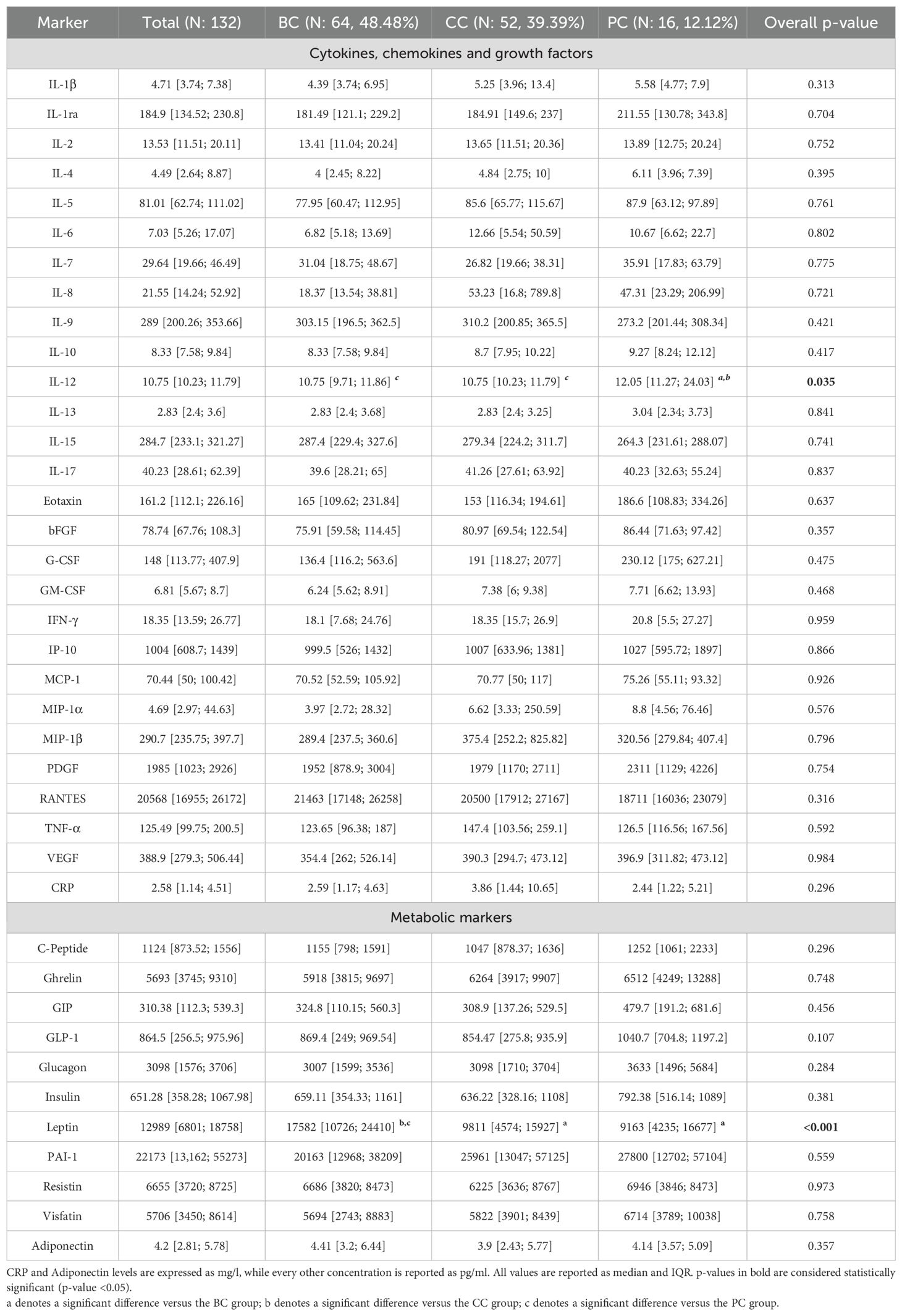 Patients’ serum was screened for the concentration of two panels of molecules: a 27-molecules array of cytokines, chemokines, and growth factors, and a 10-molecules array of metabolic markers. At the same time, circulating levels of C-Reactive Protein (CRP) and Adiponectin were screened. Overall, all factors were detectable in serum specimens (Table 2). Screened molecules displayed an overall balanced distribution among the three cancer subgroups, with the exception of a slight increase of IL-12 in PC patients, and a remarkably higher concentration of Leptin in BC patients (Table 2).