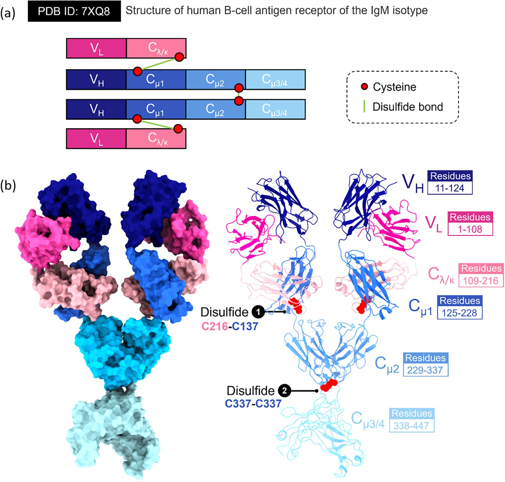 Figure 1. Structural features of the human B-cell antigen receptor (BCR) of the IgM isotype. This figure presents the molecular arrangement and interdomain architecture of the membrane-bound IgM-BCR (PDB ID 7XQ8), highlighting domain composition, disulfide connectivity, and domain-specific residue mapping. (A) Schematic representation of the IgM-BCR heavy and light chains. Each receptor comprises two identical heavy chains (VH–Cμ1–Cμ2–Cμ3/4) and two light chains (VL–Cλ/κ). Key cysteine residues (red circles) are involved in forming stabilizing disulfide bonds (green lines), including: (1) an interchain bond between Cys216 (in Cλ/κ) and Cys137 (in Cμ1), connecting heavy and light chains, and (2) a symmetric Cys337–Cys337 linkage between the Cμ2 domains of the two heavy chains. (B) left panel. Surface-rendered model of the IgM-BCR extracellular portion, showing spatial configuration and domain contacts. Individual domains are color-coded: variable light (VL, magenta), variable heavy (VH, dark blue), constant light (Cλ/κ, light pink), and constant heavy domains Cμ1 (blue), Cμ2 (cyan), and Cμ3/4 (light cyan). (b) right panel. Ribbon diagram of the full IgM-BCR, emphasizing domain boundaries and structural connectivity. The corresponding amino acid residues are indicated for each region: VL (residues 1–108), VH (11–124), Cλ/κ (109–216), Cμ1 (125–228), Cμ2 (229–337), and Cμ3/4 (338–447). Disulfide bridges are highlighted in red, with annotations identifying cysteine pairings essential for BCR assembly and structural integrity.