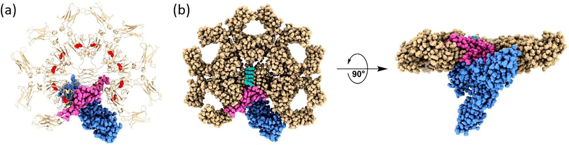 Figure 2. Structural architecture of the human IgM-Fc pentamer in complex with the polymeric immunoglobulin receptor (pIgR). Structural representation of the human secretory IgM (sIgM) pentamer in complex with the ectodomain of the human polymeric immunoglobulin receptor (pIgR), resolved by cryo-EM (PDB ID 6KXS). (a). Demonstrates a transparent ribbon model, highlighting the 5 Cμ regions (golden brown), the joining (J) chain (magenta), and the pIgR ectodomain (blue); the disulfide bonds on the Cμ3 are highlighted in red. (b) left panel. Exhibits a top-down surface rendering of the complex, demonstrating the central pentameric symmetry of IgM and the incorporation of the J chain, which serves as a nucleating element and facilitates pIgR binding. (b) right panel. Exhibits a side view rotated by 90°, highlighting the vertical alignment of the Fcμ-J-pIgR interface and the central positioning of the J chain and pIgR within the IgM pentamer. This architecture forms the basis of the molecular mechanism by which IgM engages pIgR for epithelial transcytosis and is responsible for mucosal immunity.
