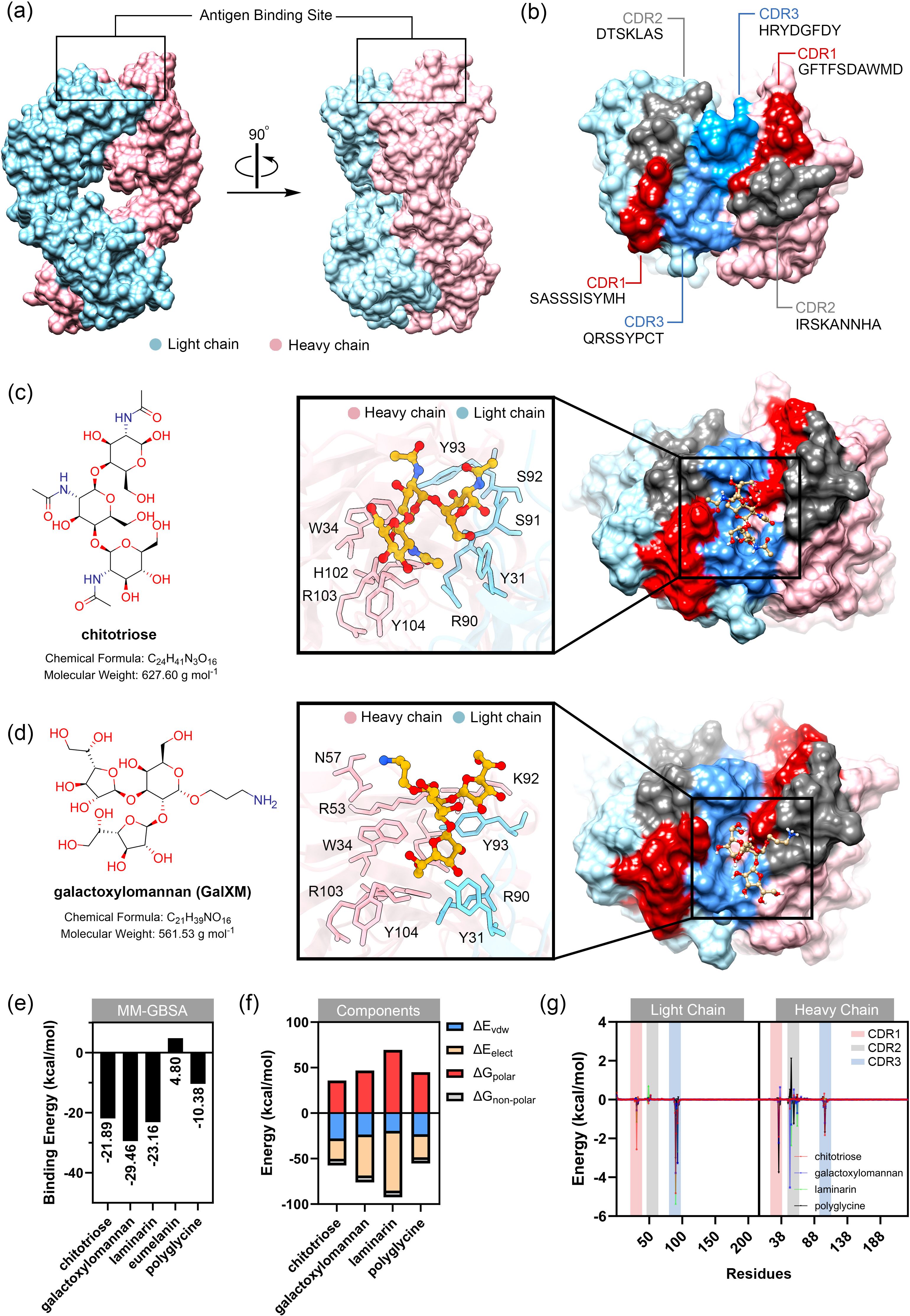 Figure 3. Preliminary study of binding between modeled MAbCC5 and selected glycans typically found in fungal cell wall. (a) Predicted structure of fragment antigen-binding region (Fab region). Antigen binding site is located at the top of the structure. Surface representation of the IgM Fab fragment highlighting the light chain (blue) and heavy chain (pink). Two orientations are shown: front view (left) and side view (right), with the antigen-binding site indicated. (b) Surface of antigen binding site. The structures are highlighted by red, gray, and blue for CDR1, CDR2, and CDR3, respectively. (c) Molecular structure of chitotriose (left) and its binding interface with IgM. The magnified-in inset shows hydrogen bonding and hydrophobic interactions between chitotriose and residues in both heavy and light chains. Key residues involved in binding are labeled, including W34, H102, Y93, and R90. (d) Molecular structure of galactoxylomannan (left) and its interaction with the IgM binding pocket. A close-up view highlights interactions with CDR residues including N57, R53, and K92. Glycan contacts span across the heavy and light chains. (e) Relative binding free energy calculated from MM-GBSA calculation. Binding to galactoxylomannan exhibits the strongest interaction energy. (f) Energy components of each complex. Decomposition of the total binding free energy into energetic components: van der Waals (ΔE_vdW), electrostatics (ΔE_ele), polar solvation (ΔG_polar), and nonpolar solvation (ΔG_nonpolar). (g) Per-residue energy decomposition analysis. Amino acid residues within CDR1, CDR2, and CDR3 that significantly contribute to binding are highlighted, supporting their central role in glycan recognition.