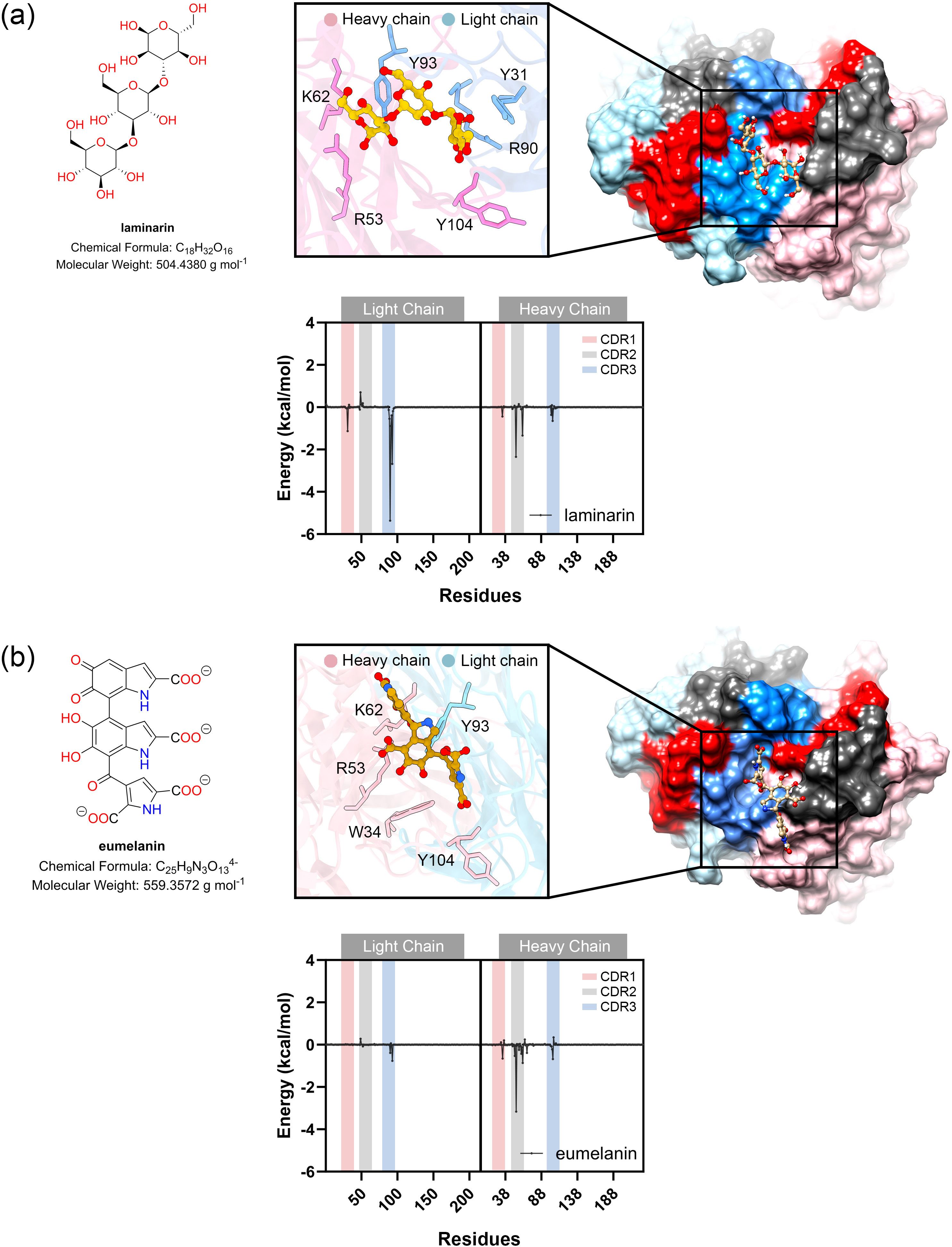 Figure 4. Molecular docking and MM-GBSA calculations of laminarin (A) and eumelain (B). Molecular docking study of ligand binding pose within antigen binding site of modeled MAbCC5. The box shows the residues with contribution of binding energy less than -0.5 kcal/mol. Per-residue energy decomposition analysis using MM-GBSA calculation is shown in the diagram below.