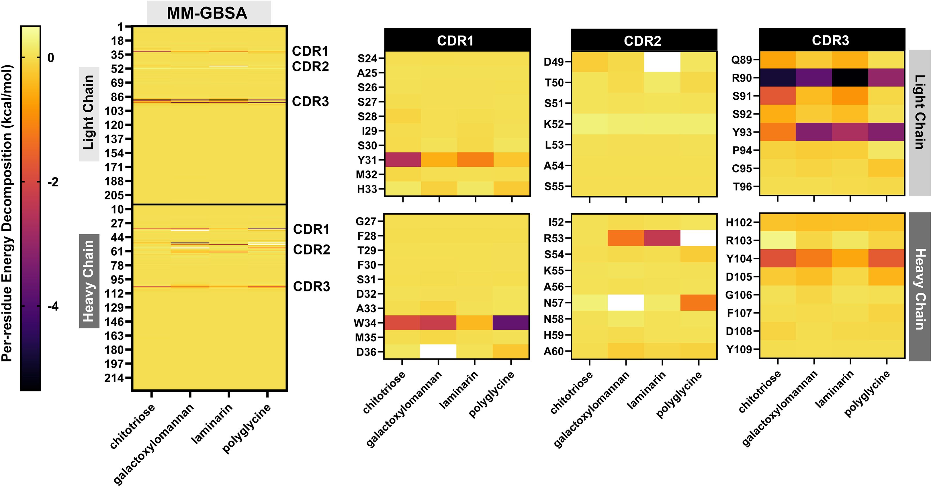 Figure 5. Demonstration by heat maps derived from per-residue energy decomposition analysis using MM-GBSA (Molecular Mechanics-Generalized Born Surface Area) calculations. The left panel shows a comprehensive overview of the energy contributions of individual residues in the modeled MAbCC5 antibody complex interacting with four ligands: chitotriose, galactoxylomannan, laminarin, and polyglycine. The heat map uses a color gradient from yellow (less favorable or neutral interaction) to red and purple (more favorable interaction, indicating stronger binding contributions), highlighting specific residues in both the light and heavy chains that significantly contribute to the binding energy. The right panel magnifies into the 3 CDRs of the light and heavy chains: CDR1, CDR2, and CDR3. These CDRs are critical for epitope recognition and binding specificity. The heat maps indicate which residues within each CDR are energetically important for binding each ligand, revealing variable binding patterns. For instance, residues Y31 in CDR1 (light chain) and W34 in CDR1 (heavy chain) show notable energetic contributions, suggesting key roles in ligand interaction. Differences in per-residue binding energies across ligands reflect distinct interaction modes, likely influenced by the chemical and structural properties of the glycan epitopes versus polyglycine.