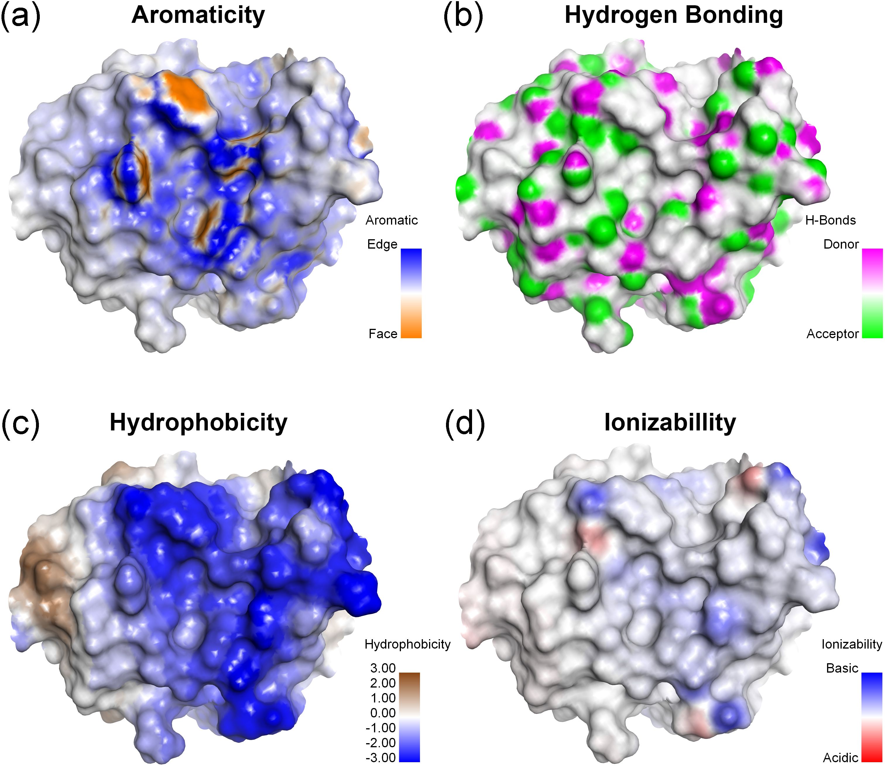 Figure 6. Surface representation of antigen binding site (Fab) of modeled MAbCC5. Surface property maps of a protein structure highlighting key biochemical characteristics relevant to molecular interactions. (A) Aromaticity: The distribution of aromatic residues is shown, with color mapping distinguishing between edge (blue) and face (orange) orientations of aromatic rings, relevant to CH–π or π–π interactions. (B) Potential for hydrogen bonding formation: Surface atoms capable of hydrogen bonding are identified, with hydrogen bond donors shown in magenta and acceptors in green, indicating potential interaction sites. (C) Hydrophobicity: The surface is colored based on hydrophobic potential, with blue regions indicating high hydrophilicity and brown regions indicating hydrophobicity, useful for identifying ligand-binding pockets. (D) Ionizability: Surface ionizable regions are visualized, with basic residues shown in blue and acidic residues in red, reflecting the electrostatic potential and protonation tendencies under the physiological pH.