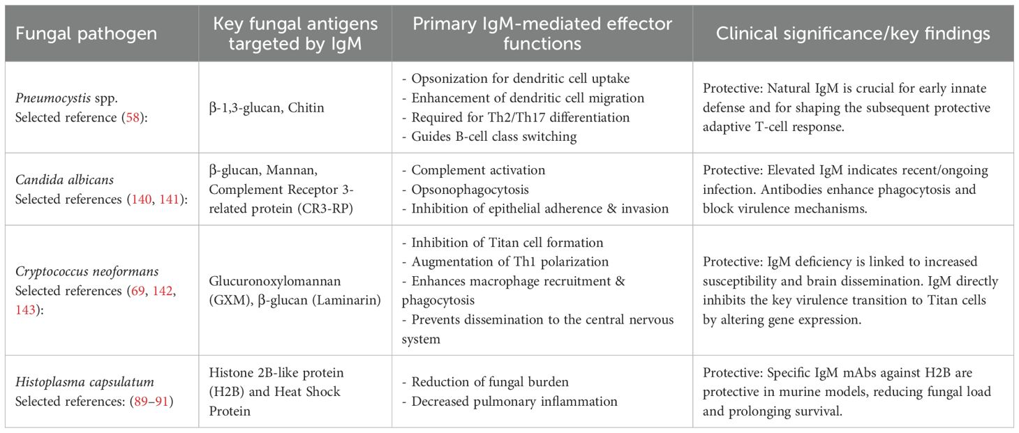 From the aspect of therapeutic strategies, the robust effector mechanisms mediated by IgM offer fertile ground for passive immunotherapeutic strategies. Monoclonal IgM antibodies directed against structurally conserved fungal glycans may serve as adjunctive agents alongside antifungal pharmacotherapies, particularly in settings marked by increasing antifungal resistance. Biological based engineering IgM antibodies for enhanced in vivo stability, facilitate tissue penetration, and glycan specificity could substantially augment host immunity. Moreover, the molecular principles governing IgM-glycan recognition are catalyzing novel vaccine design paradigms. Vaccines that preferentially elicit durable IgM responses against pan- or universal- fungal glycan epitopes may confer broad-spectrum, preemptive immunity. The potential development of pan-protective antibodies targeting these conserved fungal cell wall components represents a significant opportunity for prophylactic and therapeutic interventions in immunocompromised individuals who are particularly vulnerable to opportunistic fungal infections (138, 139). We have also assembled supporting evidence regarding the role of IgM in preventing infections caused by clinically important pathogenic fungi, as mentioned in Table 1.