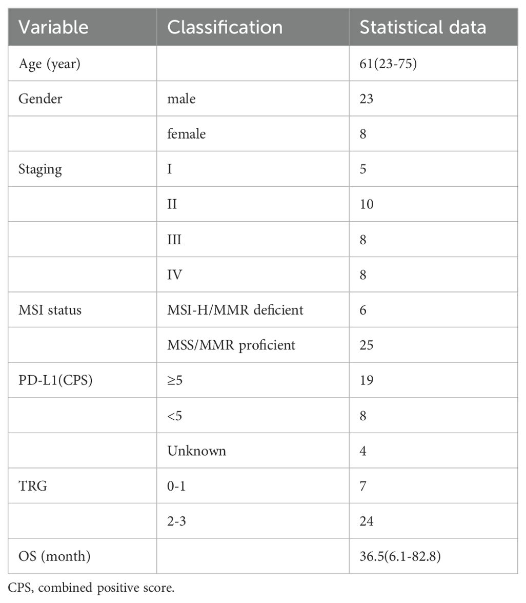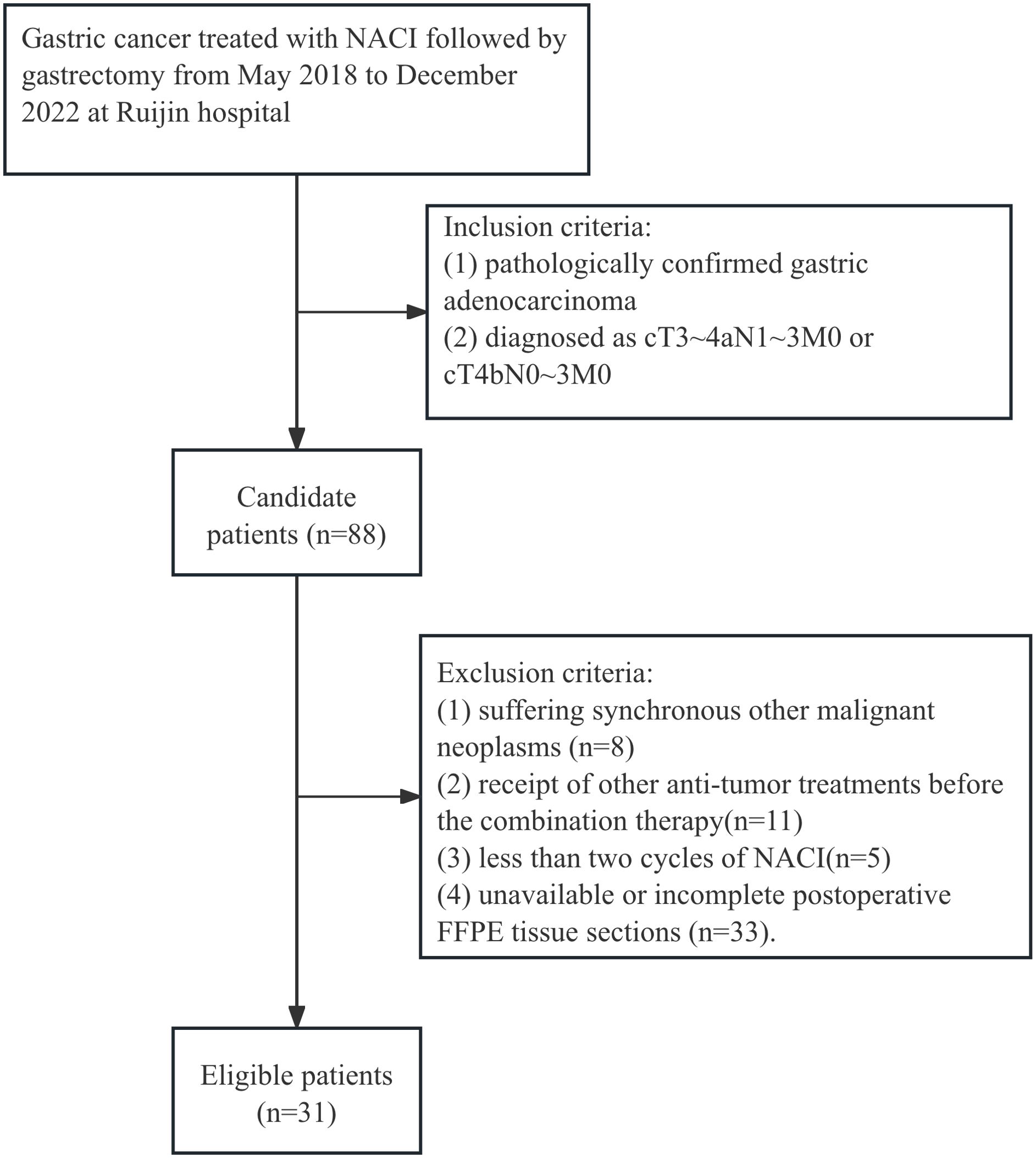 The study design is illustrated in Figure 1. This retrospective analysis encompassed 31 patients with LAGC who received anti-PD-1 drugs in conjunction with chemotherapy before gastrectomy from May 2018 to December 2022 at Ruijin Hospital, Shanghai, China. All enrolled patients fulfilled these inclusion criteria: (1) pathologically confirmed gastric adenocarcinoma; (2) diagnosed as cT3-4aN1-3M0 or cT4bN0-3M0. The exclusion criteria were (1) suffering synchronous other malignant neoplasms, (2) receipt of other anti-tumor treatments before the combination therapy, (3) less than two cycles of NACI, and (4) unavailable or incomplete postoperative FFPE tissue sections. A patient selection flowchart is shown in Figure 2. Demographic and clinicopathological data were retrieved from medical records, including age, sex, the ypTNM stage, MSI status, PD-L1 status, TRG, and follow-up data of 1-year and 3-year OS (Table 1). Ethical approvals were obtained from the Ruijin Hospital Ethics Committee, and informed consent was exempted given the retrospective nature of the study.