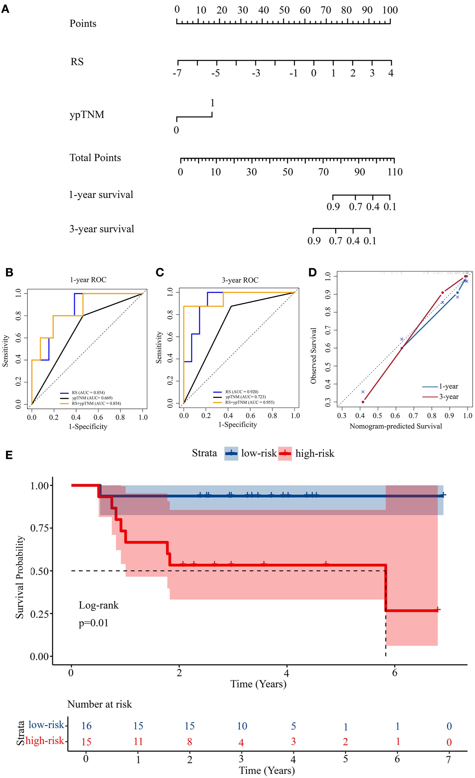 Figure 3. Construction of a prognosis prediction model. (A) Nomogram for 1-year and 3-year OS based on the RS and ypTNM. (B) 1-year ROC curves of the RS, ypTNM, and their combined model. (C) 3-year ROC curves of the RS, ypTNM, and their combined model. (D) Calibration curves of the nomogram in terms of agreement between predicted and observed 1-year and 3-year OS. (E) Kaplan-­Meier survival analysis of OS in the high-risk and low-risk groups.