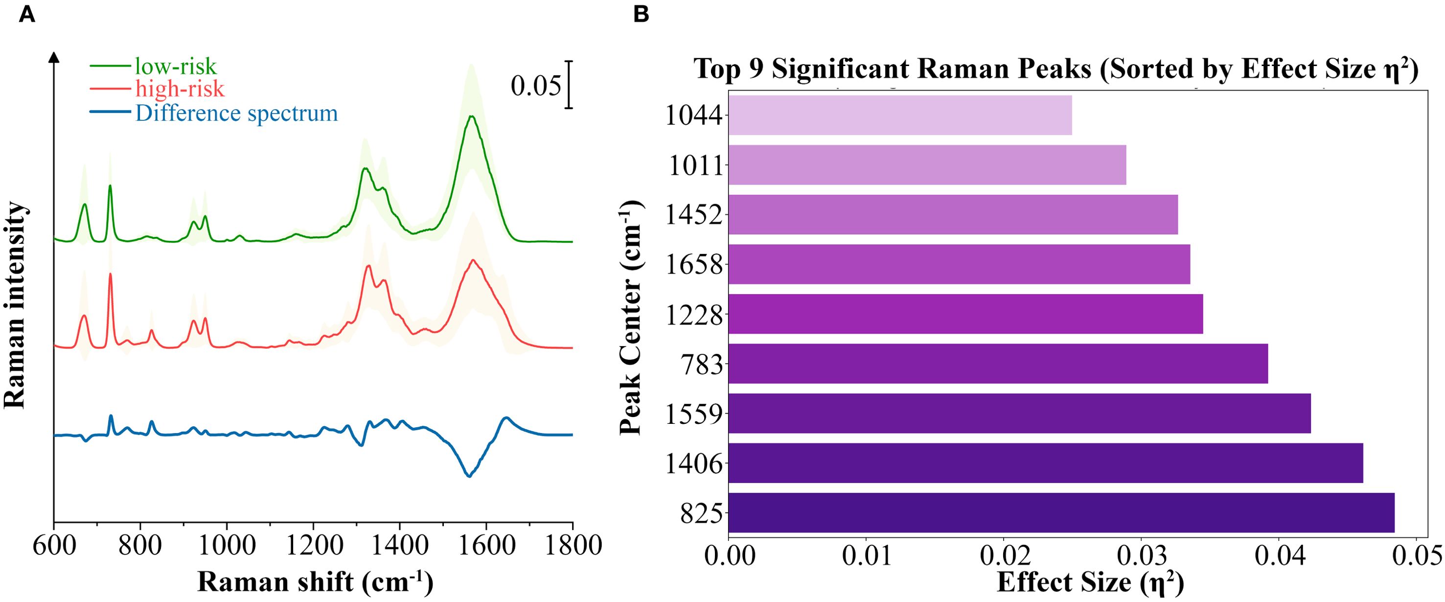 Figure 4. Analysis of the differential spectral features between the high-risk and low-risk groups. (A) Averaged SERS spectra with standard deviations of high-risk group and low-risk group samples, as well as the averaged difference spectrum (high–low). Standard deviation values are shown in shadow. (B) The top 9 significant differential bands sorted by effect size η².