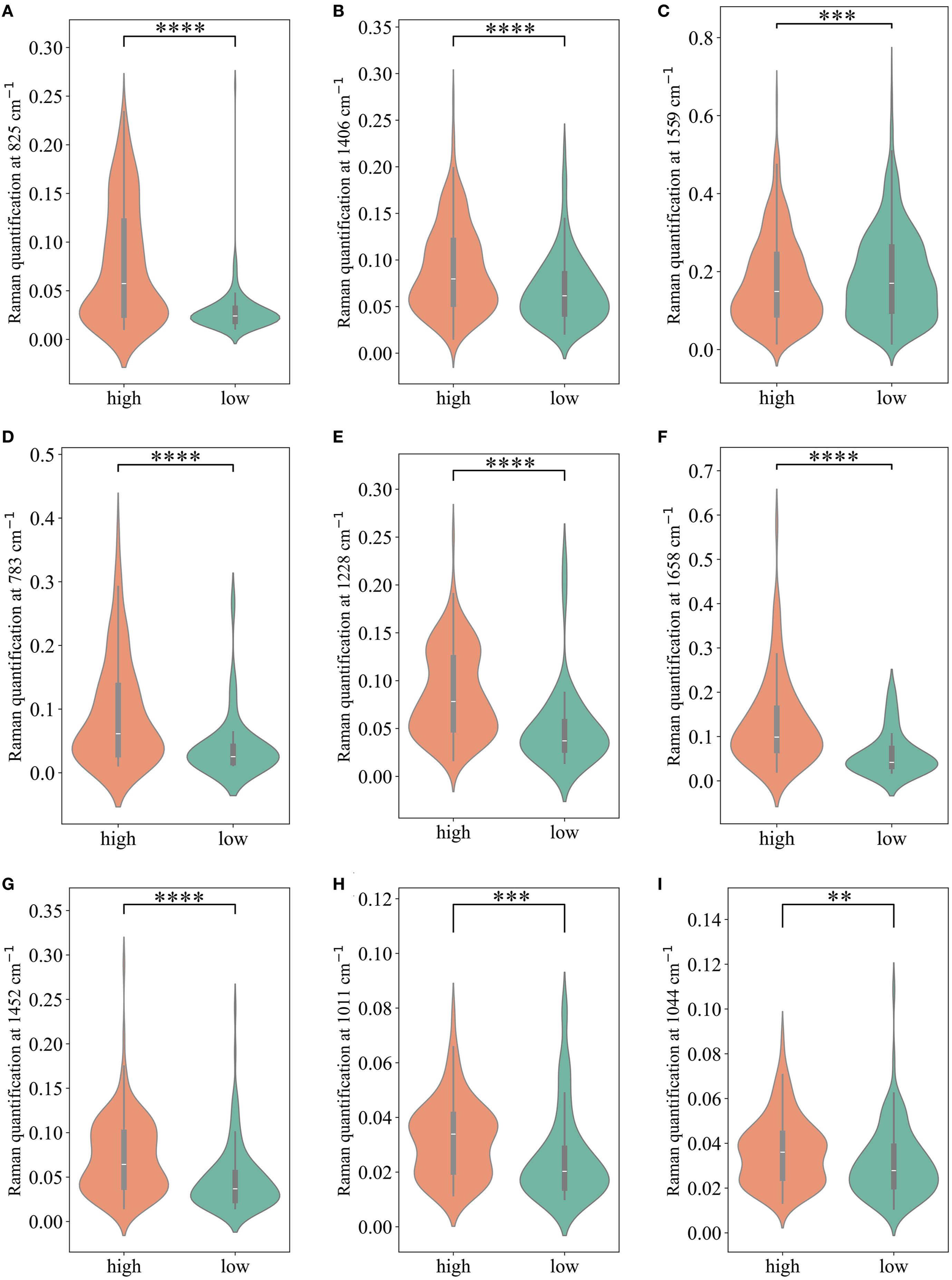 Nine violin plots labeled A to I show Raman quantification at various wavenumbers for high and low categories. Each plot compares distributions with statistical significance indicated by asterisks above the plots.