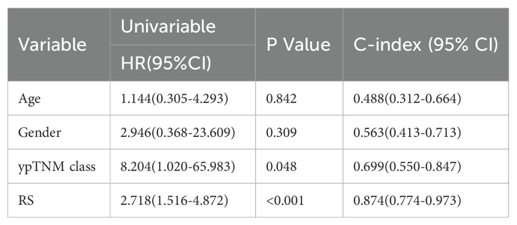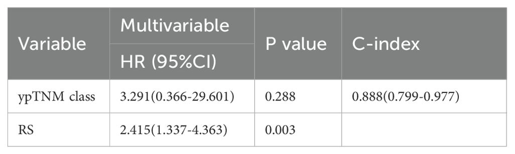 As shown in Table 2, univariate analysis identified only the RS (HR = 2.718; 95% CI: 1.516–4.872; P < 0.001) and ypTNM classification (HR = 8.204; 95% CI: 1.020–65.983; P = 0.048) as significant predictors of overall survival. HR quantifies the effectiveness of treatment (32). An HR exceeding 1 denotes poorer overall survival, whereas patients with lower risk scores generally show improved survival outcomes. Although the HR for ypTNM classification was 8.204, with a broad 95% confidence interval (95% CI, 1.020–65.983), suggesting some uncertainty in the estimate, the lower bound still exceeds 1, indicating statistical significance. Moreover, the calculated C-index of 0.699 (0.550–0.847) reflects a fair discriminative ability for survival prediction, supporting ypTNM classification as a key prognostic factor. In the multivariate analysis (Table 3), we compare the RS with the ypTNM classification. The results indicate that the RS is an independent prognostic factor of OS (HR = 2.415; 95% CI: 1.337–4.363; P = 0.003), whereas ypTNM classification shows no significant association (HR = 3.291; 95% CI: 0.366–29.601; P = 0.288).