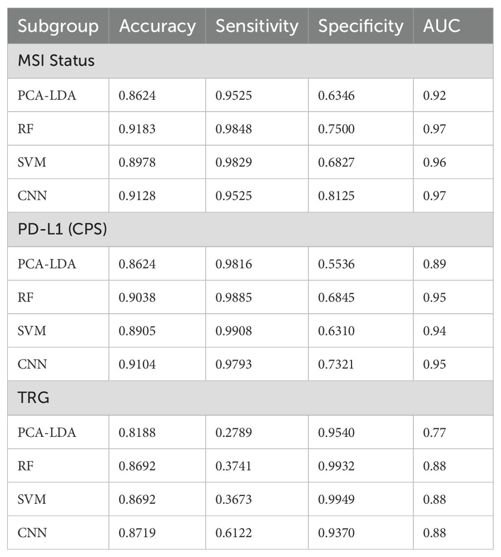To further examine the effectiveness of SERS in differentiating various histopathological and molecular features of LAGC after NACI, we performed subgroup analyses based on MSI status, PD-L1 status, and TRG. The enrolled patients were categorized into subgroups: MSI-H and MSS (3670 spectra), PD-L1 (CPS≥5) and PD-L1 (CPS<5) (3015 spectra), and TRG 0–1 and TRG 2-3 (3670 spectra). We assessed the diagnostic performance of four machine learning models: Principal Component Analysis–Linear Discriminant Analysis (PCA-LDA), Random Forest (RF), Support Vector Machine (SVM), and Convolutional Neural Network (CNN). The construction process of these models is elaborated in Supplementary Material. In the MSI-H and MSS subgroups, RF and CNN achieved high accuracies of 0.9183 and 0.9128, respectively, while SVM and PCA-LDA achieved accuracies of 0.8978 and 0.8624, respectively. In the PD-L1 (CPS≥5) and PD-L1 (CPS<5) subgroups, RF and CNN also achieved high accuracies of 0.9083 and 0.9104, respectively, while SVM and PCA-LDA achieved accuracies of 0.8905 and 0.8624, respectively. In the TRG 0–1 and TRG 2–3 subgroups, the CNN model achieved the highest accuracy of 0.8719; the accuracy of RF and SVM followed closely at 0.8692, while PCA-LDA had the lowest accuracy, still reaching 0.8188. ROC curve analysis for MSI subgroups showed AUC values of 0.92 (PCA-LDA), 0.97 (RF), 0.96 (SVM), and 0.97 (CNN). AUC values approaching 1 indicate superior algorithm performance. This verifies that within the MSI status subgroup, all four models demonstrated strong classification efficacy. In the PD-L1 status subgroups, AUCs of 0.89, 0.95, 0.94, and 0.95 were achieved by the PCA-LDA, RF, SVM, and CNN models, respectively. Except for the marginally lower performance of PCA-LDA, RF, SVM, and CNN all showed notably better classification performance for the MSI status subgroup. ROC analysis of the TRG subgroups yielded AUC values of 0.77 (PCA-LDA), 0.88 (RF), 0.88 (SVM), and 0.88 (CNN). RF, SVM, and CNN models demonstrated equivalent classification performance, whereas PCA-LDA remained inferior to the other three models. The performance metrics for the four classification models across subgroups are summarized in Table 5, including accuracy, sensitivity, specificity, and AUC. The ROC curves and confusion matrices are depicted in Supplementary Figures S3-6.
