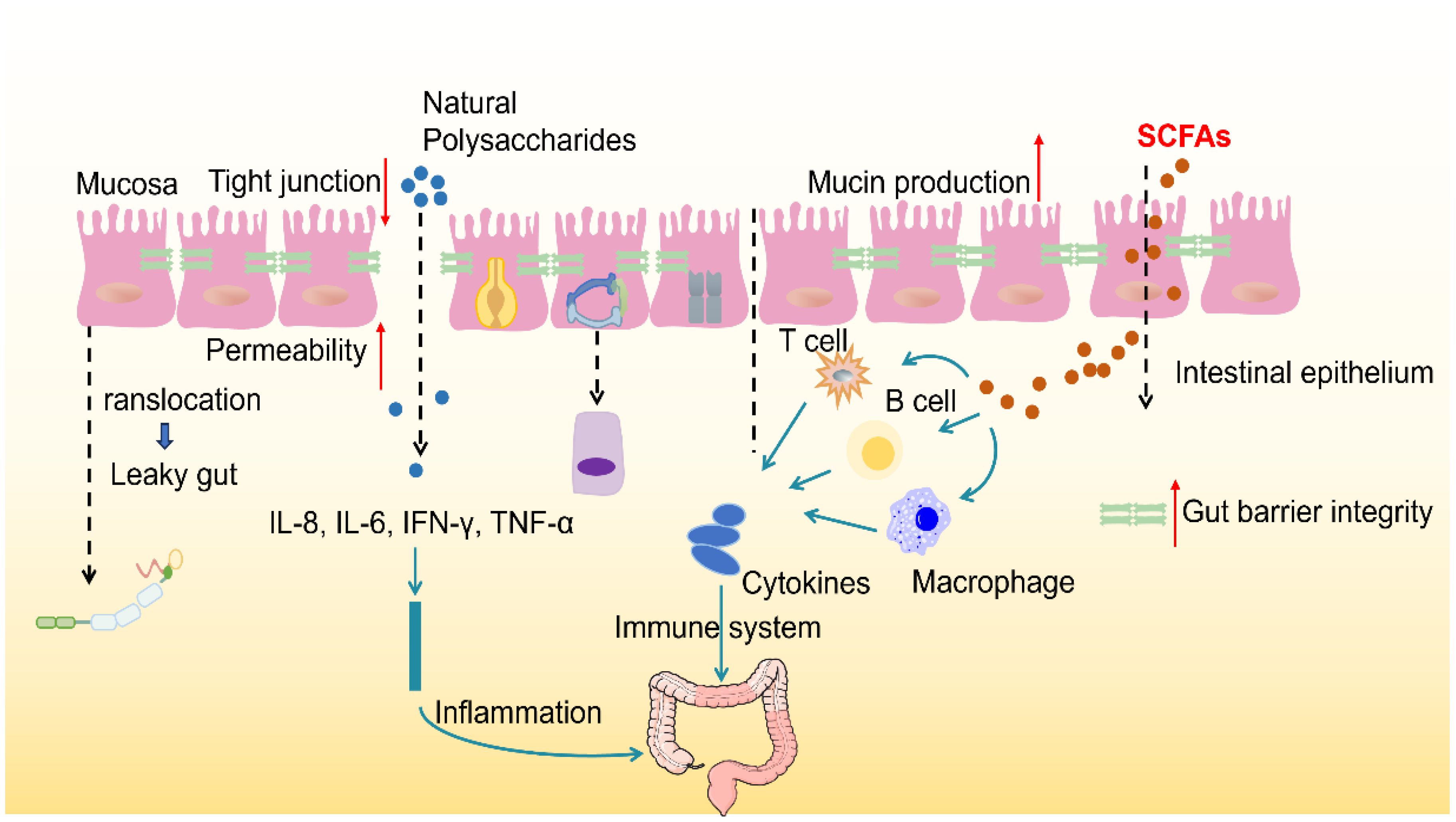 Figure 2. Polysaccharides modulate gut microbiota and enhance gut barrier function. The healthy gut barrier consists of a Tight layer of IECS, which are interconnected by Tight junctions that control the Permeability of matter. In good health, the intestinal immune system maintains the immune balance by secreting cytokines (such as IL-2, IL-5, IL-6, IL-9, TNF-α and IFN-γ) and activating immune cells (such as T cells, B cells and macrophages). Mucins, antimicrobial peptides and secretory IgA can form biochemical barrier and enhance intestinal protective function. Goblet cells secrete mucins that form a dense, sticky, and permeable gel that coats the intestinal mucosa, preventing erosion by microbes. Once the tight junctions are broken, a phenomenon known as Leaky gut is formed, which increases intestinal permeability and allows harmful substances and pathogens to enter the bloodstream.