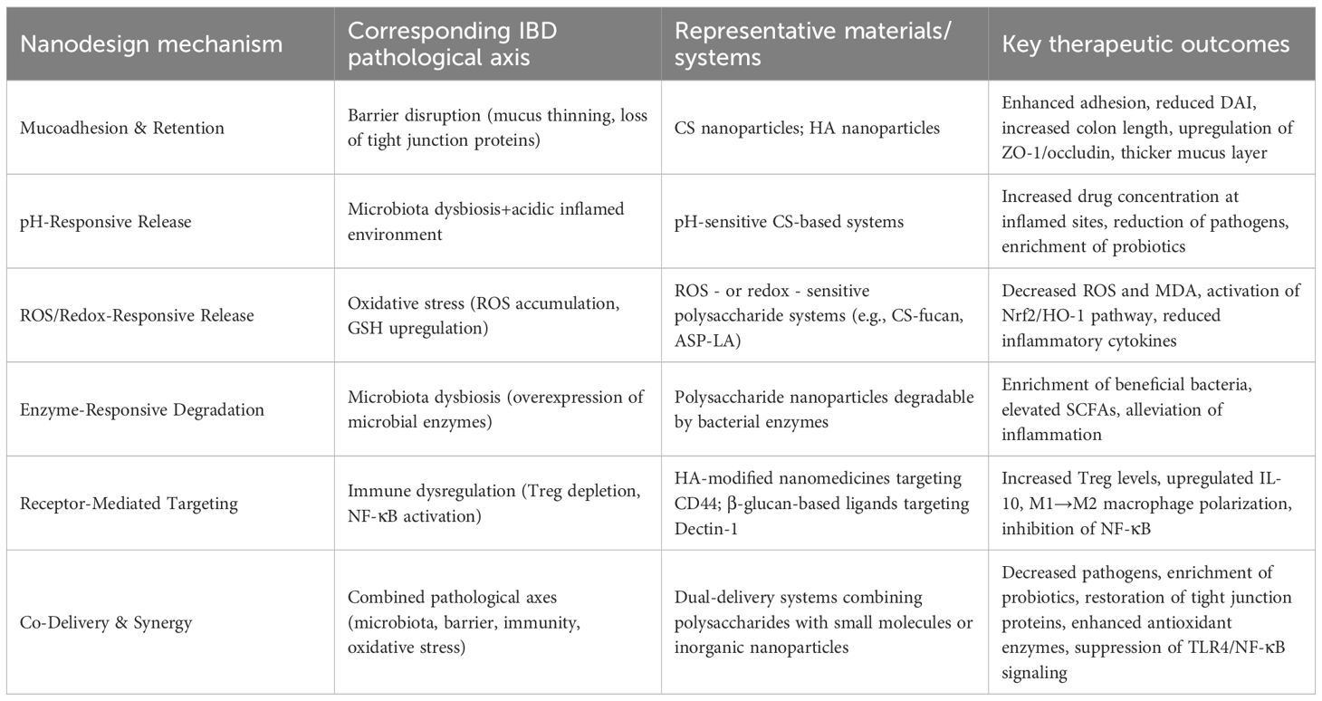 We therefore conceptualize polysaccharide nanomedicines as mechanism amplifiers: mucoadhesion and receptor targeting extend residence (boosting barrier repair); pH/ROS/enzyme responsiveness gates on-site release (boosting anti-inflammatory and antioxidant actions); and co-delivery strategies align metabolic support (SCFAs) with immune reprogramming (Tregs↑, M1→M2). The following subsections organize the evidence not by polymer name, but by pathophysiological lever addressed, creating a one-to-one mapping between IBD axes and nanodesign features. Natural polysaccharides are attractive candidates for nanocarrier development in IBD therapy due to their inherent bioactivity, pH responsiveness, gastric stability, susceptibility to colonic microbial degradation, and strong mucoadhesive properties (172–176). By modifying functional groups on their surfaces, polysaccharide-based nanocarriers can be engineered to encapsulate drugs, achieve sustained release, and selectively target specific gut microbial populations (177).