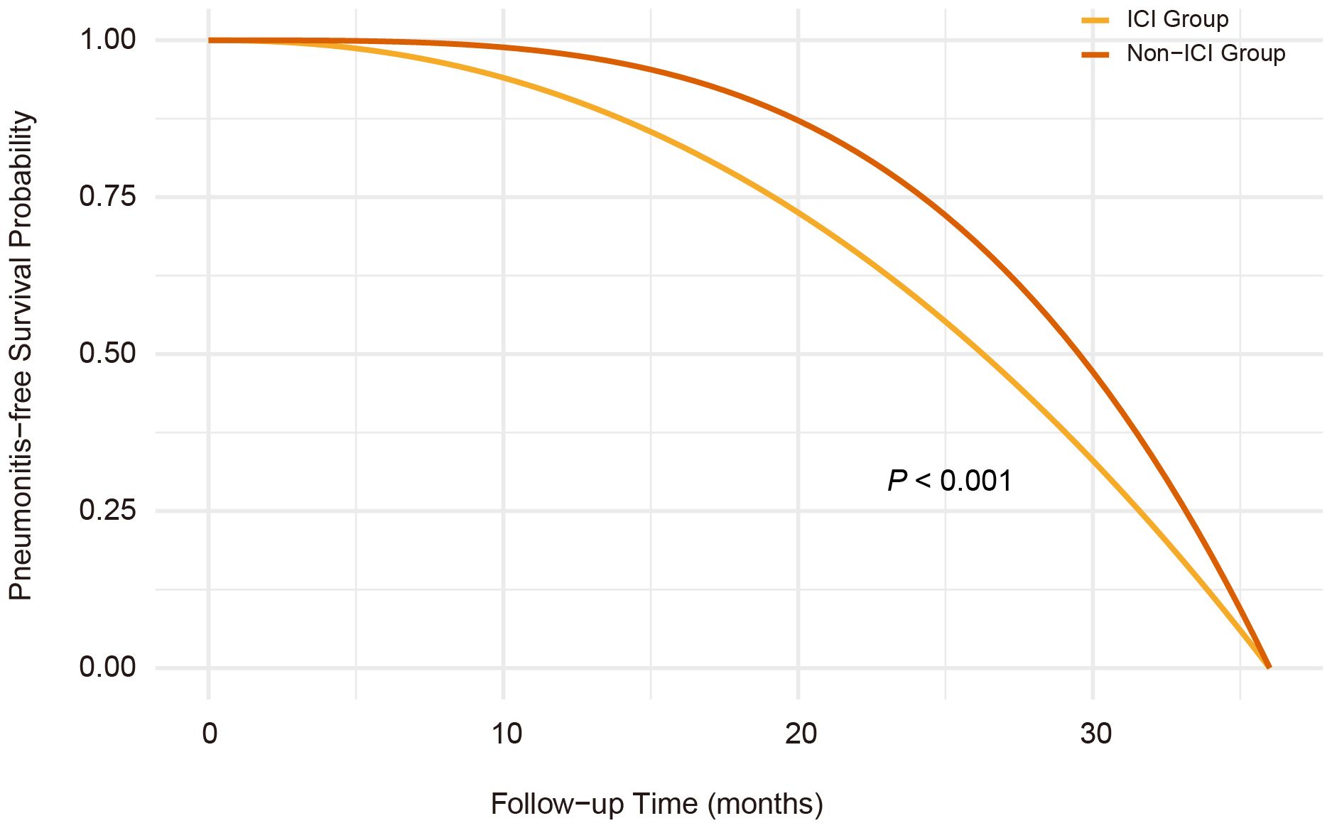 Figure 1. Kaplan-Meier curves of pneumonitis-free survival in radiotherapy-ICI versus radiotherapy-nonICI groups. Pneumonitis-free survival was significantly shorter in the radiotherapy-ICI group than in the radiotherapy-nonICI group (P<0.001, log-rank test), with early divergence of survival curves. The cumulative incidence of pneumonitis was 28.9% in the radiotherapy-ICI group and 10.0% in the radiotherapy-nonICI group.
