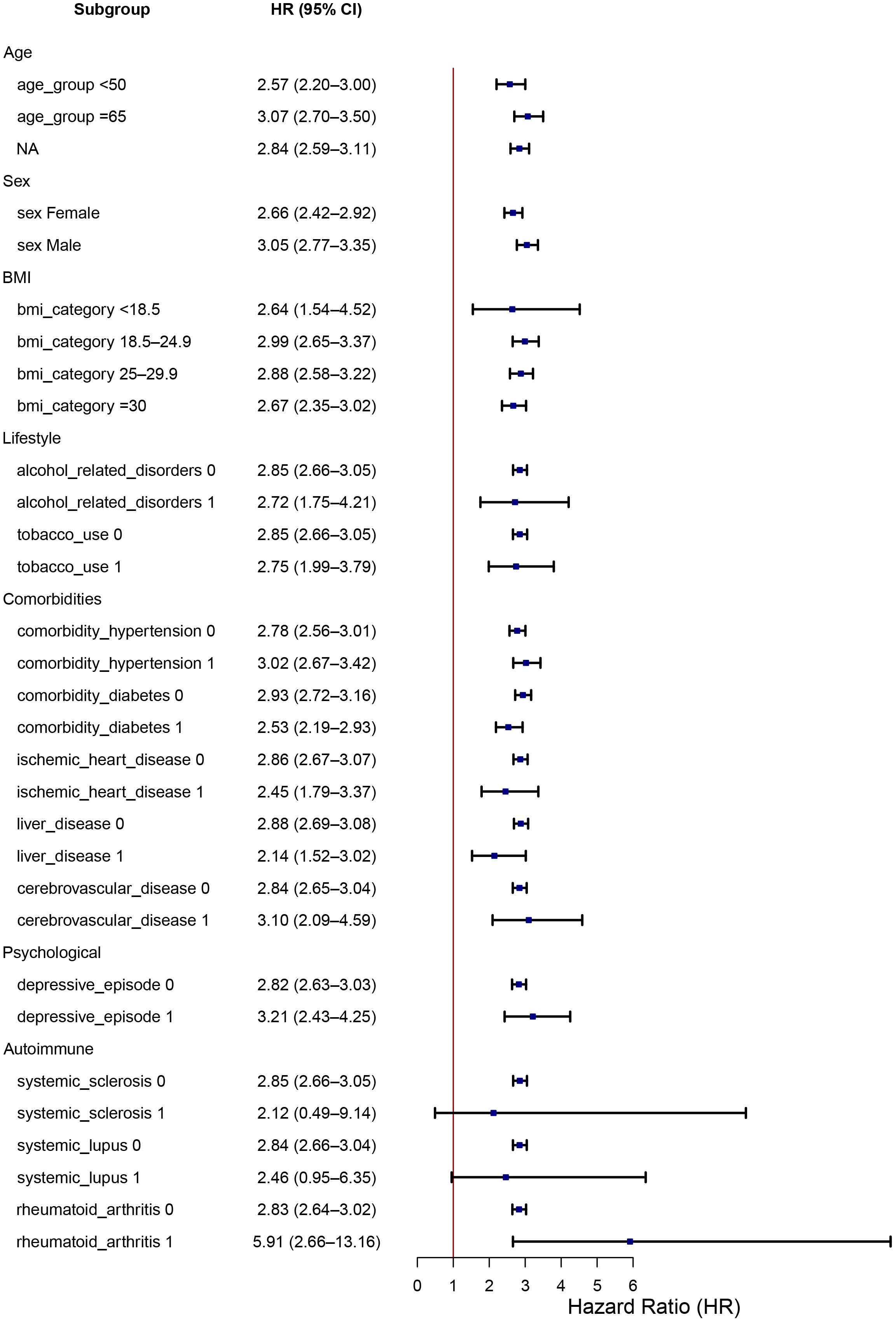 Figure 2. Subgroup analysis of HR for pneumonitis in patients receiving concurrent radiotherapy-ICIs. Forest plot displaying the risk of pneumonitis (hazard ratio and 95% CI) across clinical subgroups including sex, age, BMI, smoking status, comorbid autoimmune disease (RA, SLE), psychiatric conditions, and medication use. The increased risk of pneumonitis remained consistent across most subgroups, with notably higher risk among patients with autoimmune conditions and those using RT-ICI therapy.