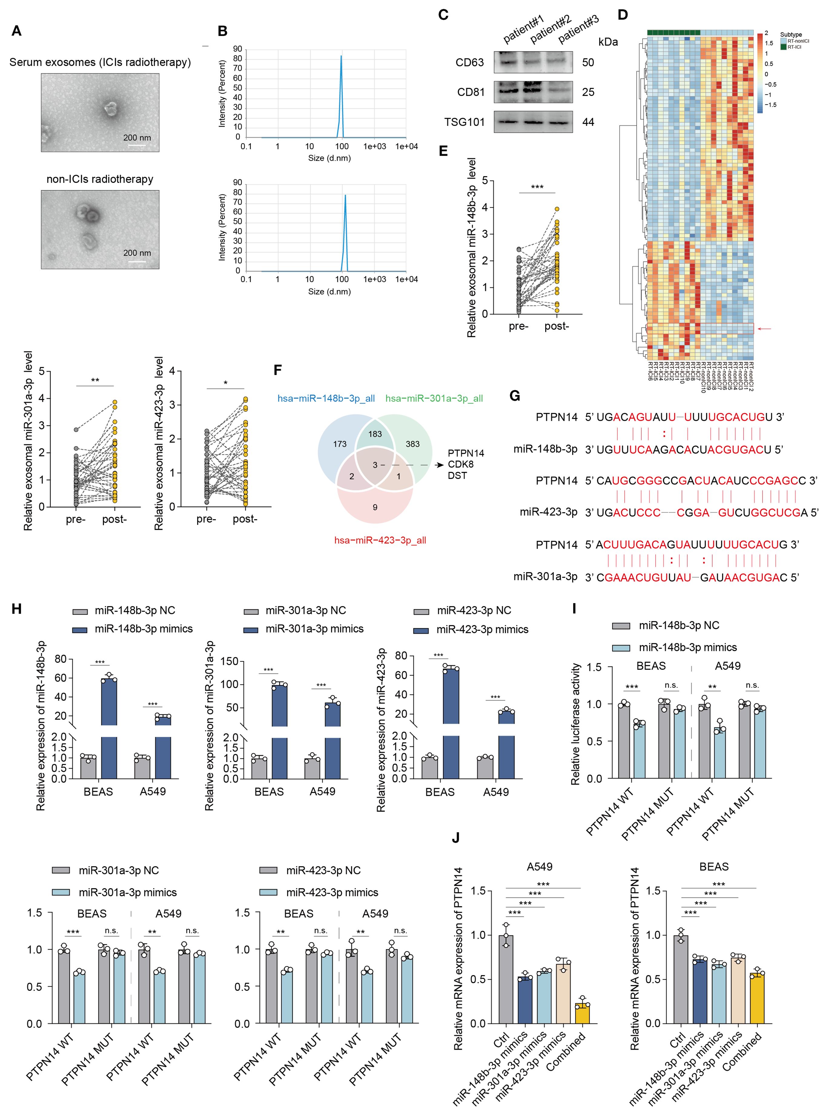 Figure 3. Exosomal miRNA profiling identifies a predictive signature for radiotherapy-ICI-associated pneumonitis. (A–C) Characterization of serum exosomes by TEM, NTA, and Western blot (CD81/CD63/TSG101). (D) Hierarchical clustering of differentially expressed miRNAs between radiotherapy-ICI and radiotherapy-alone cohorts. (E) qPCR analysis of serum miR-148b-3p, miR-301a-3p, and miR-423-3p levels in radiotherapy-ICI patients pre- and post-pneumonitis. (F) Venn diagram of target genes shared by the three miRNAs by Starbase database. (G) Schematic of miRNA binding sites in the PTPN14 3’UTR. (H) qPCR validation of miRNA mimic transfection efficiency. (I) Dual-luciferase assay confirming miRNA-PTPN14 3’UTR binding (luciferase activity normalized to WT). (J) qPCR analysis of PTPN14 suppression by individual or combined miRNA mimics. *P < 0.05, **P < 0.01, ***P < 0.001.