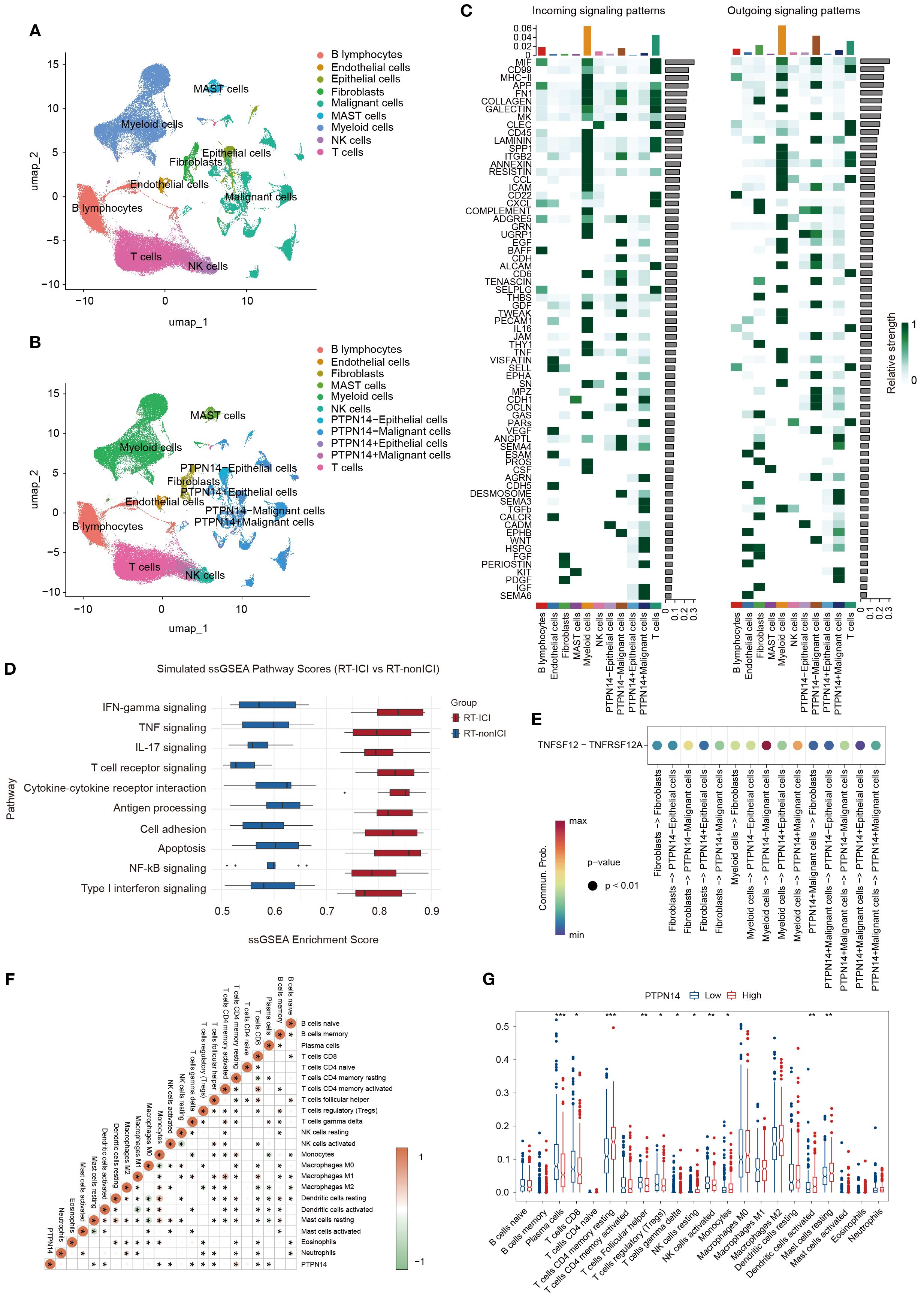 Figure 4. Intercellular communication analysis of lung tissue samples from patients with and without PTPN14 expression. (A) UMAP plot identifying various cell types. (B) UMAP plot of cell classification based on PTPN14 expression. (C) Heatmap of outgoing and incoming signaling between various cell types. (D) Dot plot of immune-related enriched pathways, highlighting activation of IFN-γ, Th17, TNF, and JAK-STAT signaling in PTPN14 low samples. (E) Ligand-receptor pairs of TNFSF12-TNFRSF12A signaling pathway between various cell types. (F) Heatmap of correlation between PTPN14 and various cell types. (G) The relative proportions of various cell types in the high and low PTPN14 groups. *P < 0.05, **P < 0.01, ***P < 0.001.