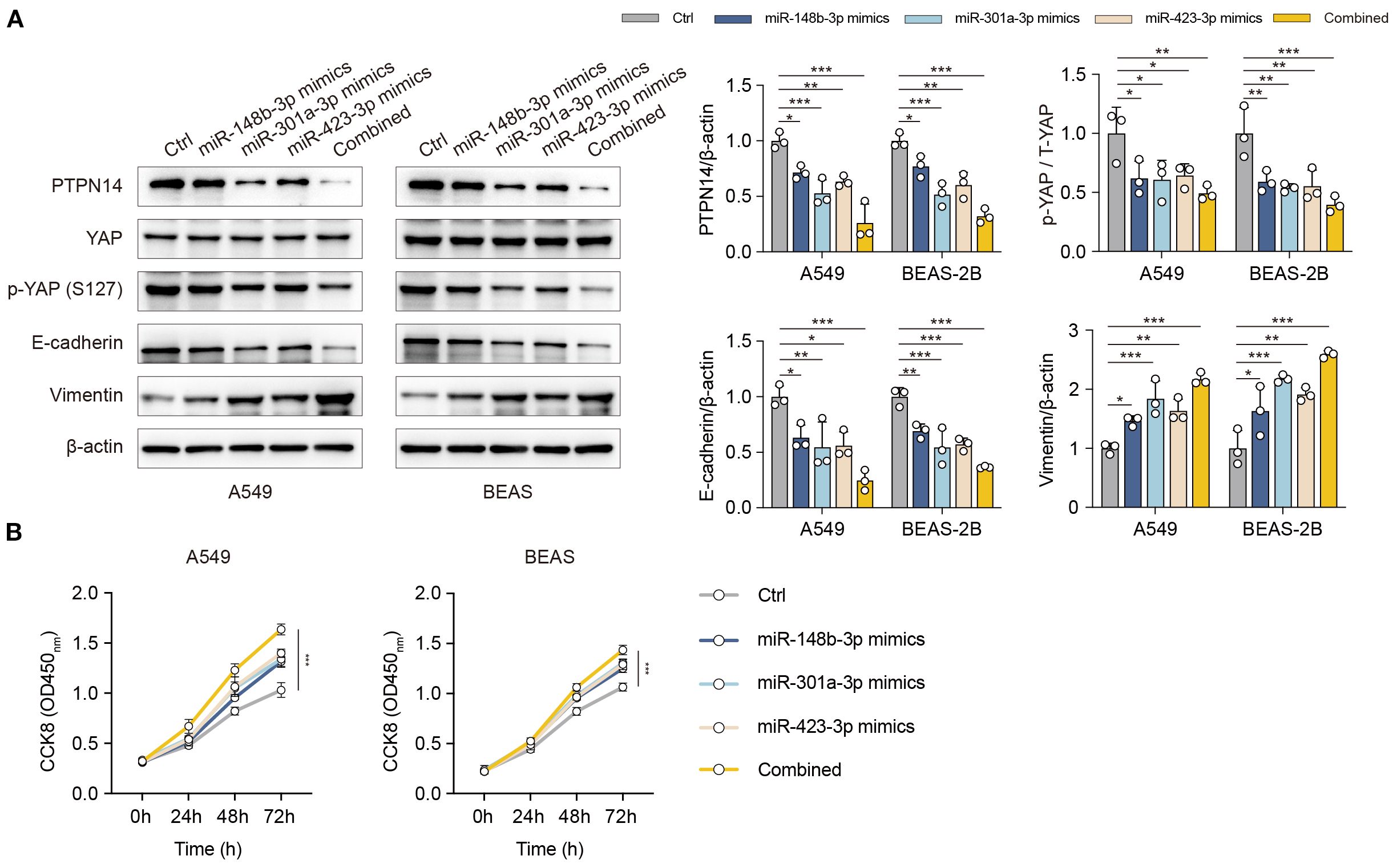 Figure 5. The miR-148b-3p/miR-301a-3p/miR-423-3p cluster promotes EMT-associated fibrosis via the PTPN14/YAP axis. (A) Western blot analysis of PTPN14, YAP, p-YAP, E-cadherin, and Vimentin in A549 and BEAS-2B cells following overexpression of the miRNA cluster or individual miRNAs. (B) Cell proliferation assessed by CCK-8 assay in cells overexpressing the miRNA cluster or individual miRNAs. Data represent mean ± SD; *P < 0.05, **P < 0.01, ***P < 0.001