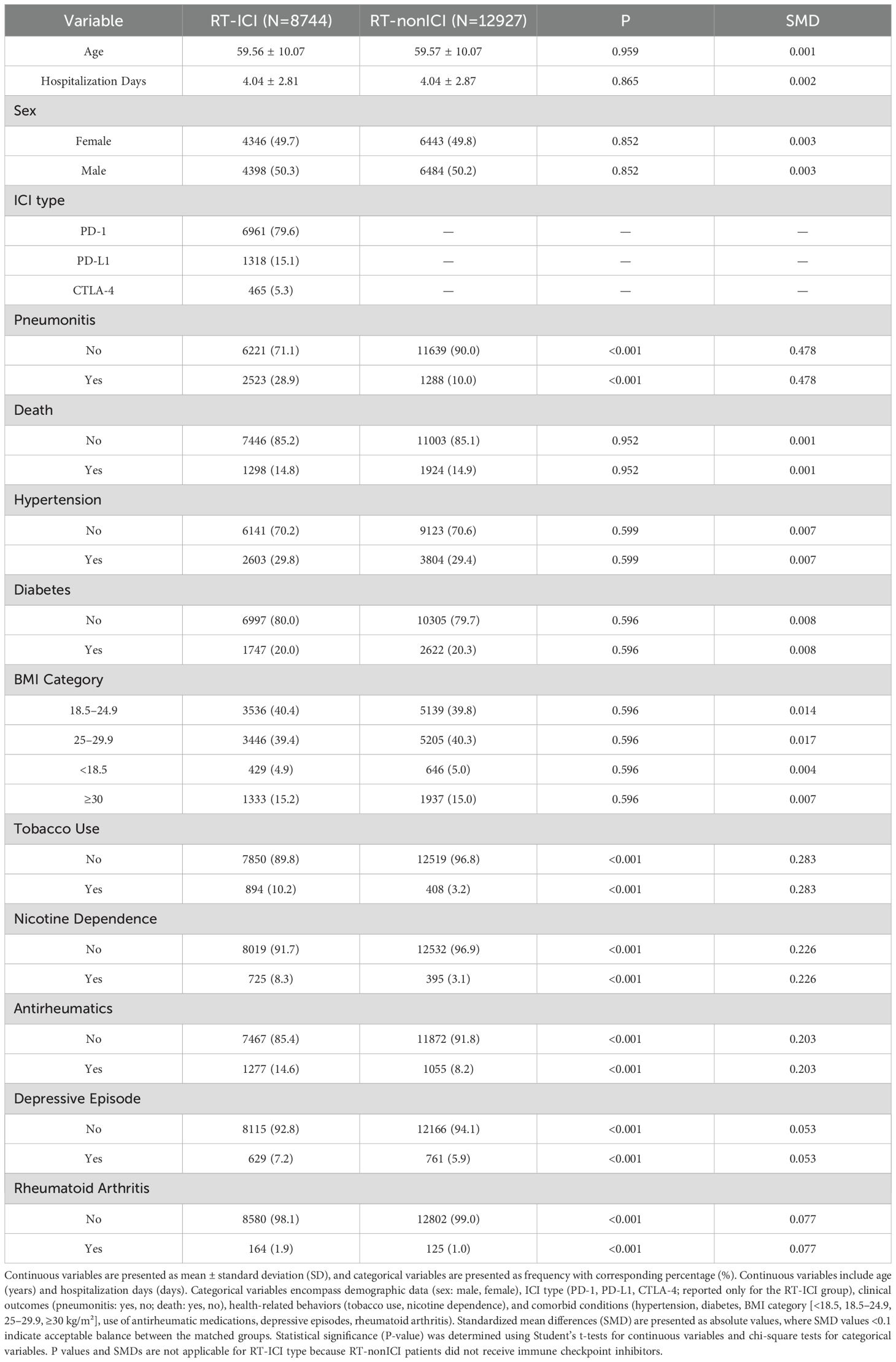 Following 1:1 propensity score matching of 21,671 NSCLC patients, two balanced cohorts of 8,744 patients each were generated: one treated with RT and ICIs and the other with RT but non-ICI therapies. Demographic and clinical profiles, including age, sex, BMI, smoking history, comorbid conditions, and medication use, were comparable between the two groups, ensuring baseline equivalence (Table 1).