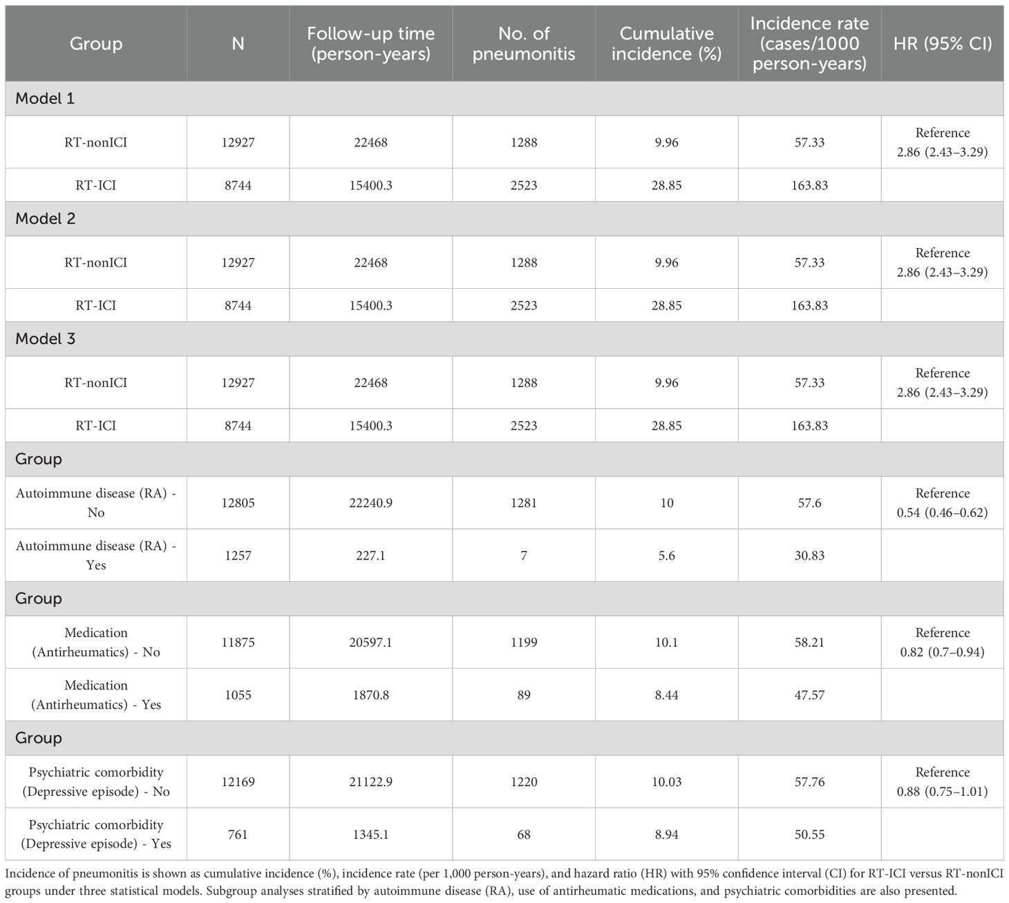 Table 2. Incidence rates and HR for pneumonitis in RT-ICI versus RT-nonICI groups across models and subgroups.