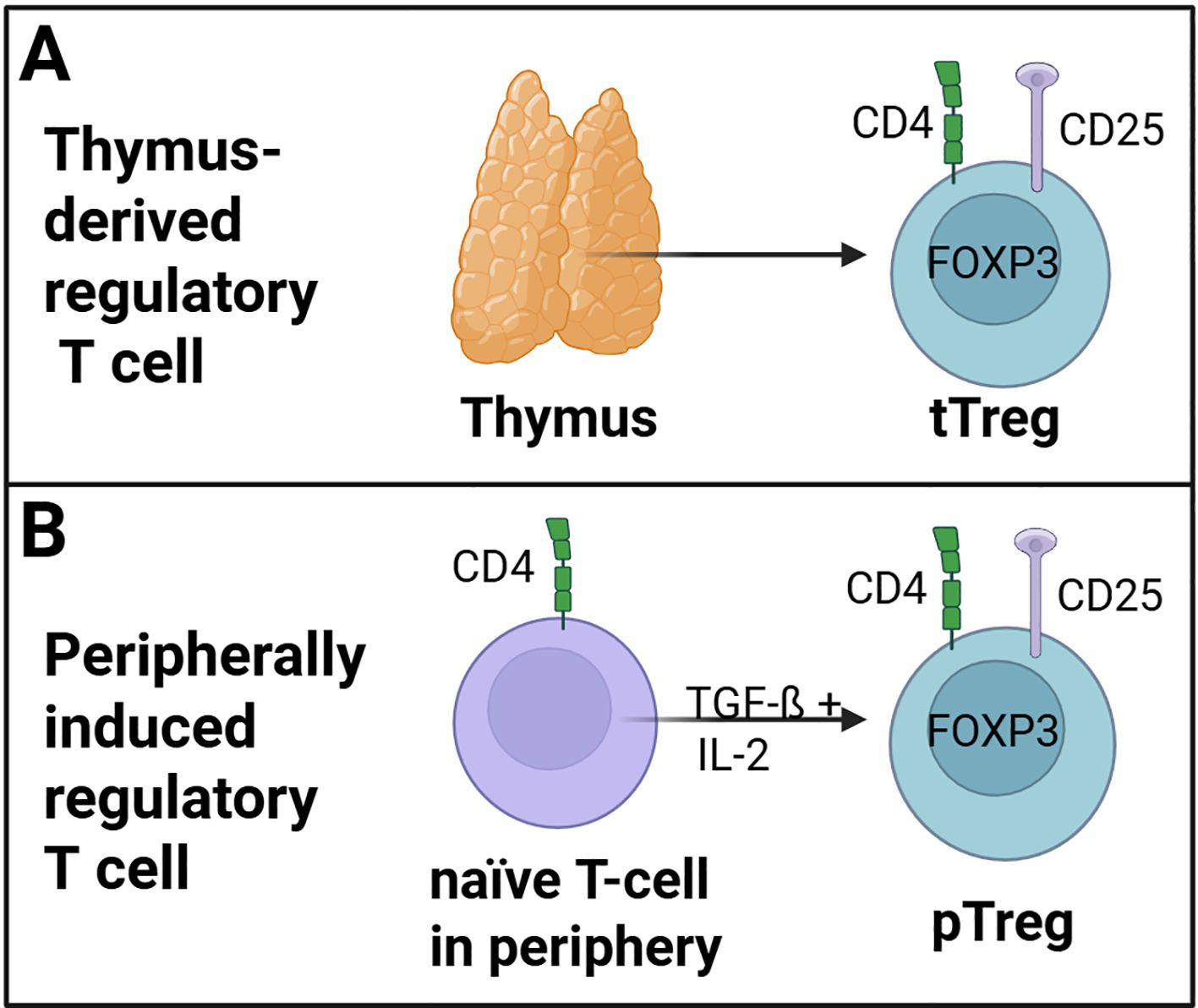 Figure 1. Regulatory T cell (Treg) subsets. (A) tTregs are derived from naïve CD4+ T cells within the thymus. (B) pTregs developed as naïve CD4+ T cells and transformed into FOXP3-expressing pTregs cells in the peripheral tissue trough TGF-ß and IL-2 stimulation. (Created in https://BioRender.com).