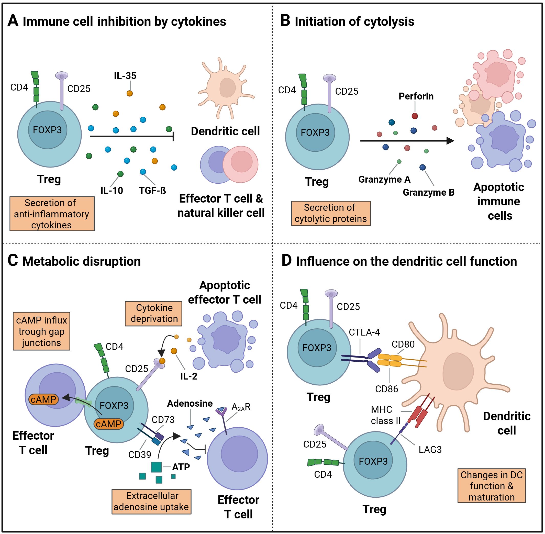 Figure 2. Treg immune regulation. (A) The process of immune suppression by regulatory T cells (Tregs) can be achieved through the secretion of cytokines, such as IL-10, IL-35 and TGF-ß. (B) The initiation of apoptosis following cytolysis is accompanied by the secretion of granzyme A and B, as well as perforins. (C) The disruption of metabolism is facilitated by the influx of cAMP into target cells via gap junctions, the deprivation of cytokines, and the production of extracellular adenosines. (D) The maturation and function of dendritic cells (DC) can be influenced by cell surface receptor proteins, including CTLA-4 and LAG3, which are expressed on Treg cells. (Created in https://BioRender.com). Adapted from “How regulatory T cells work” by Vignali, (D) et al, 2008, Nat Rev Immunol 8, 523-532.