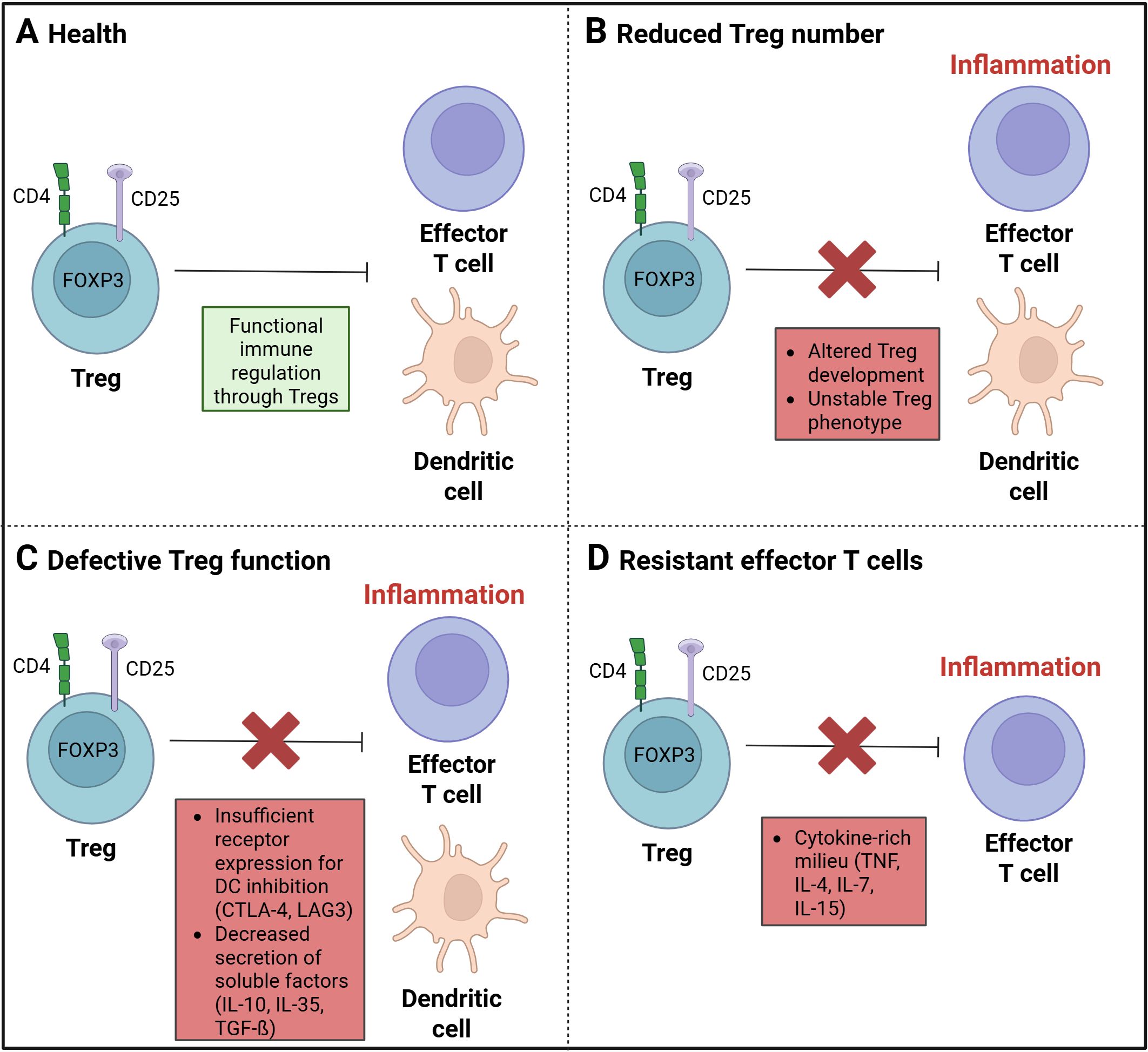Figure 3. Treg dysregulation in inflammatory diseases. (A) A balanced and functional immune regulation by regulatory T cells (Tregs) is found in a state of health. (B) A disruption in immune regulation, resulting from a decrease in Treg cells, has been linked to a state of imbalance and dysfunction. Such a disturbance may be attributed to either an aberrant Treg development process or an unstable Treg phenotype. (C) The function of Treg cells can be affected by insufficient receptor expression for the DC inhibition through CTLA-4 or LAG3. A decrease in the secretion of soluble factors, such as IL-10, IL-35, or TGF-ß, may also result in dysfunction rather than significant anti-inflammatory effects. (D) A cytokine-rich milieu, comprising TNF, IL-4, IL-7, and IL-15, may improve the development of effector T cells (Teffs) and suppress the Treg function against Teffs. (Created in https://BioRender.com).
