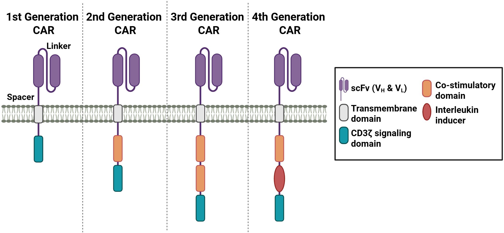 Figure 4. Different generations of CAR receptors. CAR receptors contain a scFv domain, which is connected through a spacer sequence to the transmembrane domain. Depending on the generation, one or more co-stimulatory domains and a CD3 signaling domain are incorporated. The fourth generation of CAR receptors contains an interleukin inducer domain. (Created in https://BioRender.com).