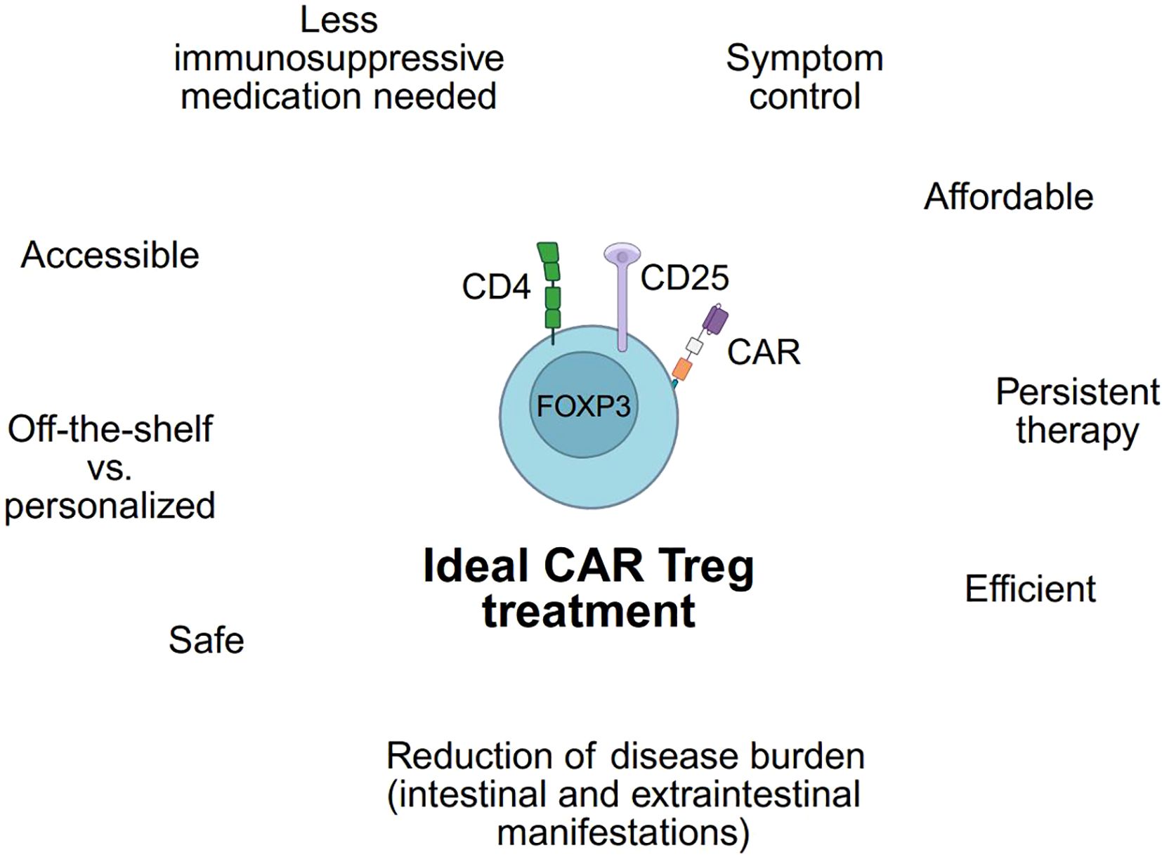 Many preclinical and clinical trials will have to be conducted before the ideal CAR Treg therapy for patients with IBD can become standard-of-care. This ideal CAR Treg product not only should be efficient, persistent, and safe but lead to a significant reduction in symptom and disease burden while remaining accessible and affordable (Figure 5). Whether an off-the-shelf product or a personalized product with autologous Treg will be a more feasible approach needs to be addressed in future research.