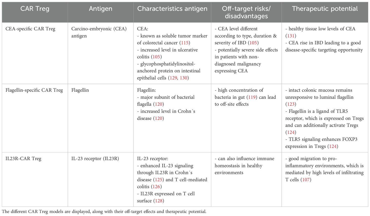 In the study, the analysis of CEA-specific CAR Tregs was undertaken to ascertain their therapeutic potential in patients suffering from colitis (105). A stable phenotype of these cells, characterized by the expression of FOXP3 in the engineered CAR Tregs, was observed. They demonstrated the characteristic enhancement in IL-2 and IFN-γ secretion by anti-CEA CAR T cell activation and an enhancement of the IL-10 level following anti-CEA CAR Treg activation upon antigen exposure. Subsequent suppression assays showed an improved suppression of CD4+ effector T cells through anti-CEA CAR Tregs when stimulated by CEA antigen. In this study, a decrease in IL-2 levels and a suppression of Teff proliferation were observed. Furthermore, the study noted that i.p. injected CEA-specific CAR Tregs accumulated in the colon of diseased CEABAC-10 mice (105). CEABAC is a human “bacterial artificial chromosome” that contains part of the CEA family gene cluster, which consists of the CEACAM5, CEACAM3, CEACAM6, and CEACAM7 genes (116). The name CEABAC-10 refers to the number of copies of the CEABAC transgene in the mouse model’s genome (116). The expression of CEA is predominantly observed within the gastrointestinal tract (117, 118). Membrane anchorage of CEA is attributed to two distinct groups: glycophosphatidylinositol (GPI)-anchored members, including CEACAM5, CEACAM6, and CEACAM7, and transmembrane members, such as CEACAM3 (116). In a transfer colitis mouse model, which is achieved by injection of anti-CEA CAR CD4+ Teffs, suppressive effects and inhibitory effects on abdominal accumulation of the anti-CAR CD4+ Teffs were achieved by treatment with CEA-specific CAR Tregs. The CAR Tregs showed also in the AOM-DSS model colitis-suppressive effects (105).