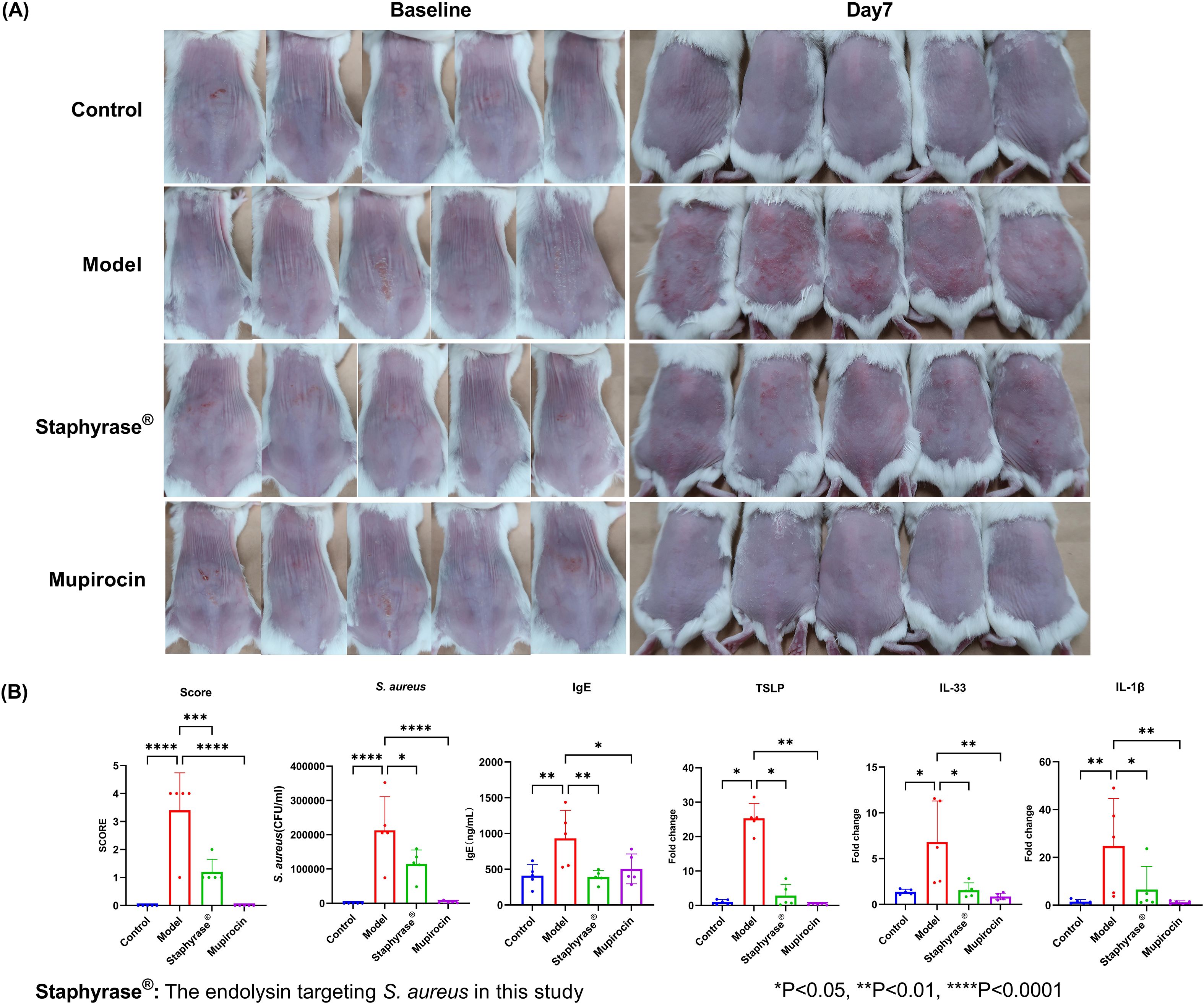 Figure 2. Therapeutic effects of Staphyrase® endolysin BALB/c mice AD model. (A) Staphyrase® endolysin treatment demonstrates significant lesion improvement compared to the Model group. (B) Staphyrase® endolysin reduces inflammatory factors in BALB/c mice AD model. (Statistical significance is noted with asterisks. *p<0.05, **p<0.01, ***p<0.001, ****p<0.0001).