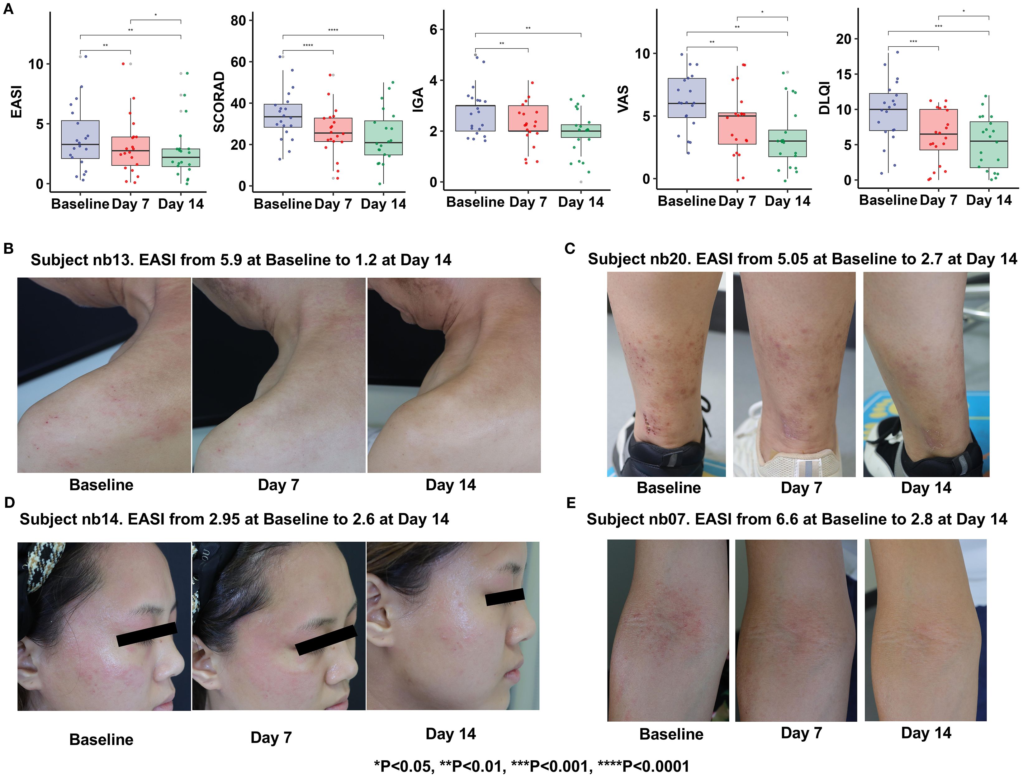 Curative effect observation showed that Subject nb13: male. After 14 days of treatment with Staphyrase® Gel, cervical and scapular redness and edema resolved significantly, with EASI decreasing from 5.9 to 1.2 (79.7% reduction) and VAS from 9 to 1. Subject nb20: Female, acute phase. After treatment, Pedal papules, scratching, and redness improved substantially, with EASI declining from 5.05 to 2.7 (46.5% reduction) and pruritus VAS from 10 to 2. The facial papules, edema and redness of Subject nb14, as well as the papules and scratching of the cubital fossa of Subject nb07 were significantly improved, demonstrating the Staphyrase® Gel’s efficacy across acute and chronic AD lesions (Figures 3, 4A).