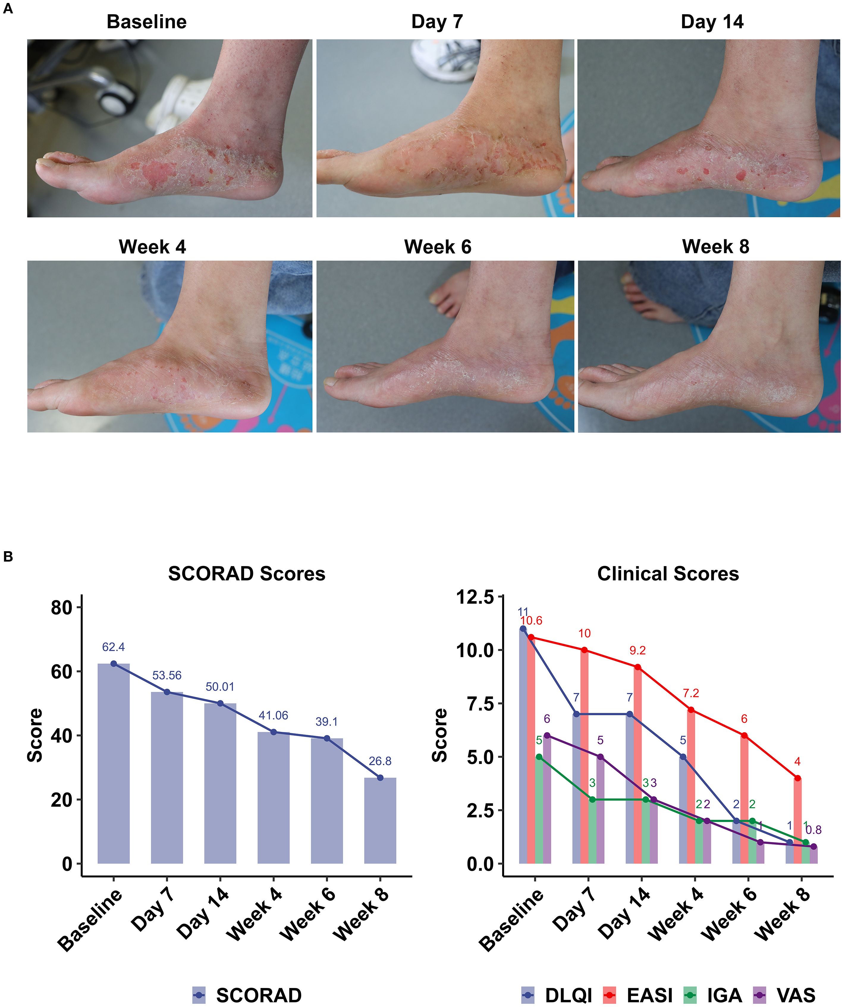 EASI decreased from Baseline 10.6 to 9.2 at Day 14, further declining to 4.0 at Week 8 (62.26% reduction from Baseline); SCORAD decreased from Baseline 62.4 to 53.56 at Day 14 and 26.8 at Week 8 (Δ-57.05%); IGA decreased from Baseline 5 points (severe) to 3 points (moderate) at Day 14 and 1 point (mostly resolved) at Week 8; VAS decreased significantly from Baseline 6 points to 3 points at Day 14 (Δ-50.0%), and only 0.8 points at Week 8 (Δ-86.7%); The DLQI improved from the Baseline 11 points to 7 points at Day 14 (Δ-36.4%) and finally to 1 point (Δ-90.9%).