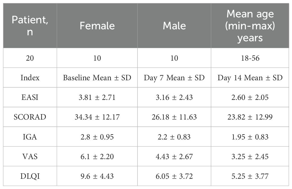 Twenty study participants (aged 18 to 56 years) were included in male or female adults with an AD diagnosis meeting Hanifin criterion (> 3 essential features and > 3 secondary features) and had been present for at least 6 months prior to enrollment (EASI ≤ 21 at enrollment). All study participants completed the study without tolerance problems (Clinical registration Number: ChiCTR2500101921). Efficacy outcomes before and after treatment are presented in Table 1.