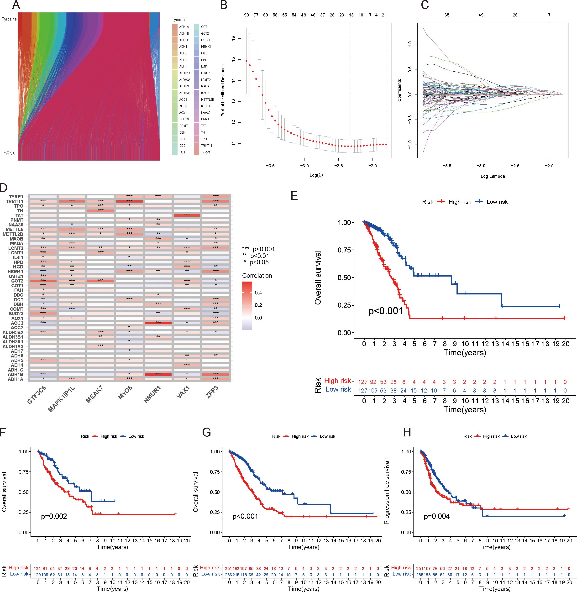 Figure 2. Screening of independent prognostic TRGs. (A) Sankey diagram showing the coexpression relationships between tyrosine-associated genes and TRGs. (B) Prognostic model establishment through LASSO Cox analysis. (C) Cross-validation of the minimum lambda value in the LASSO regression model. (D) Heatmap showing the correlations between these seven independent prognostic factors and TRGs, with red representing a positive correlation and green representing a negative correlation. (E–G): OS survival analysis of different risk score groups in the training (E), validation (F), and total cohorts (G). (H) PFS survival analysis of the total population.