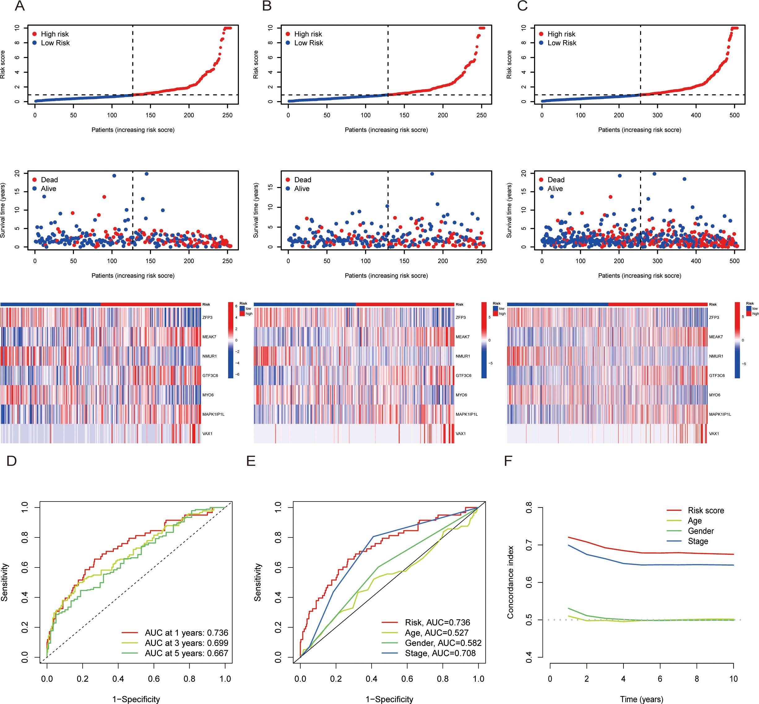 Figure 3. The prognosis assessment of the risk scores. (A-C): Risk score curves, survival status plots and heatmaps between the high- and low-risk score groups in the training (A), validation (B) and total cohorts. (D): AUC curves of risk scores according to year. (E) AUC curves of the clinical indicators and risk scores. (F) Concordance index of clinical indicators and risk scores. AUC = area under the ROC curve.