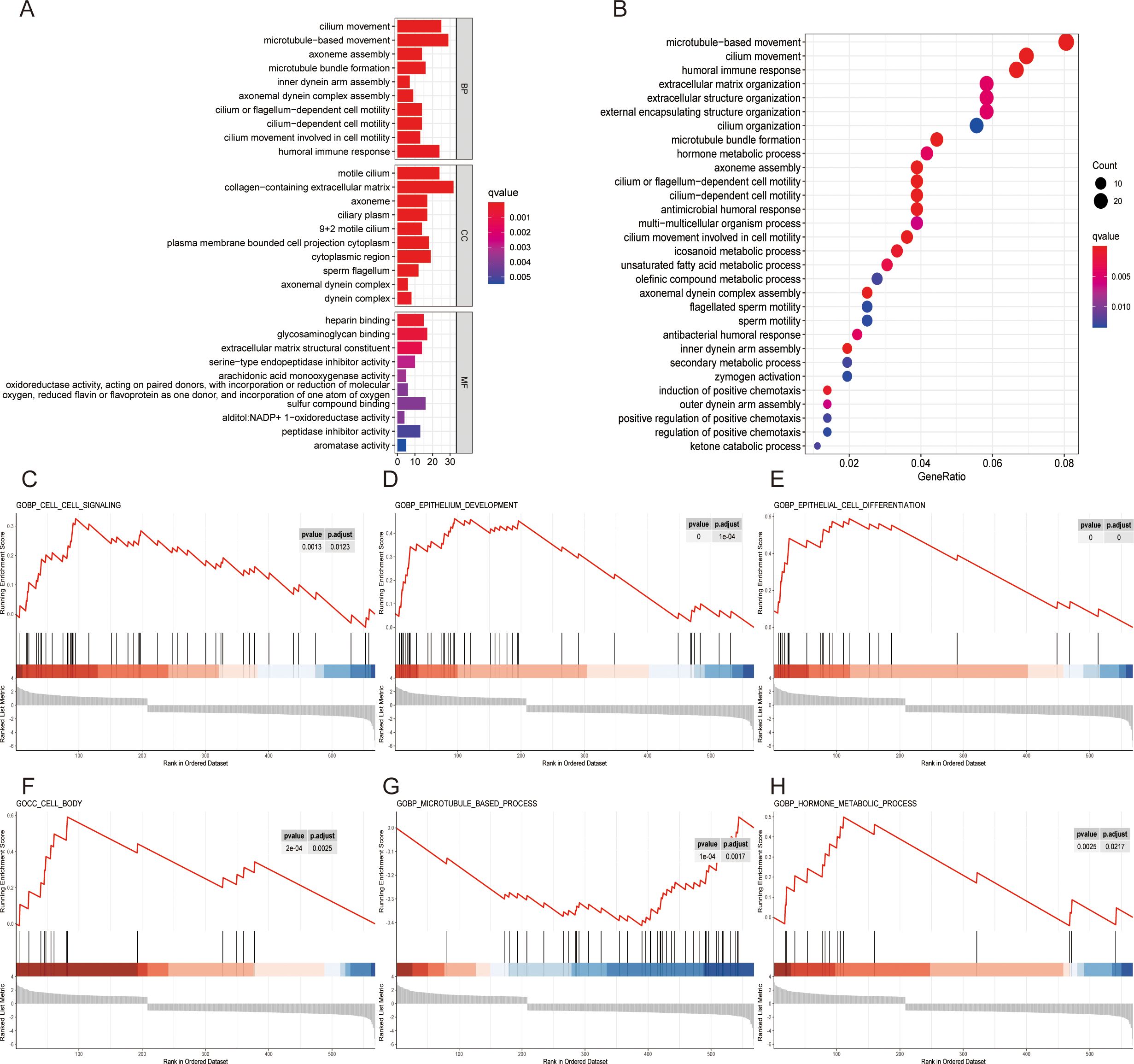 Figure 4. Exploration of potential mechanistic pathways. (A) GO enrichment analysis of the top ten mechanistic pathways for molecular function (MF), cellular component (CC) and biological process (BP). (B) KEGG enrichment analysis of the top 30 pathways in different risk groups. (C-H) Enrichment of functional pathways by GSEA in different risk score cohorts: cell signaling (C), epithelium development (D), epithelial cell differentiation (E), cell body (F), microtubule-based process (G) and hormone metabolic process (H).