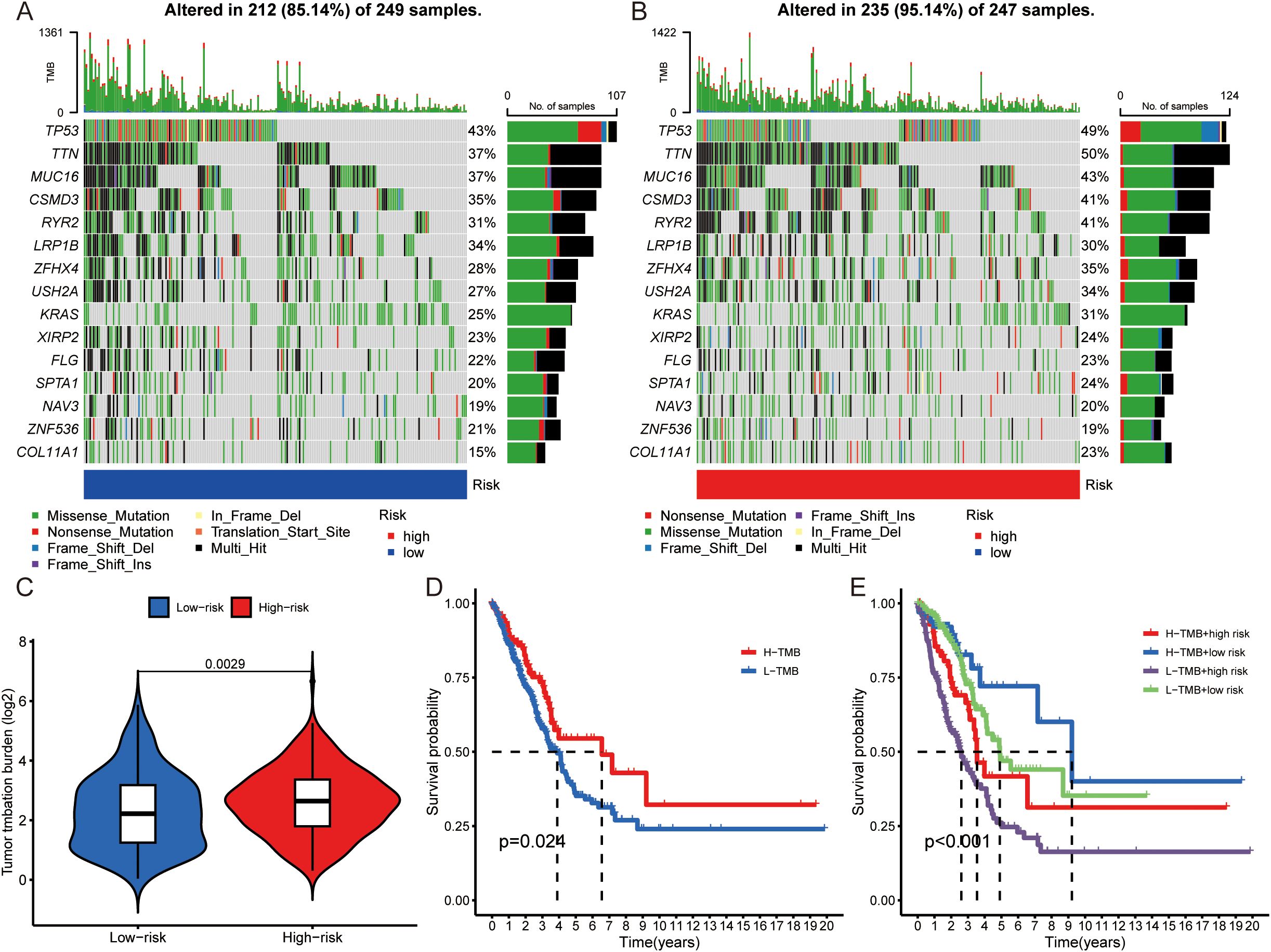 Figure 5. Comparison of TMB analysis. (A, B) Mutation landscapes of the low- (A) and high- (B) risk score groups. (C) TMB differences between high- and low-risk score patients. (D) Kaplan–Meier survival analysis according to TMB subtype. (E) Kaplan–Meier survival analysis of the TMB and risk score.